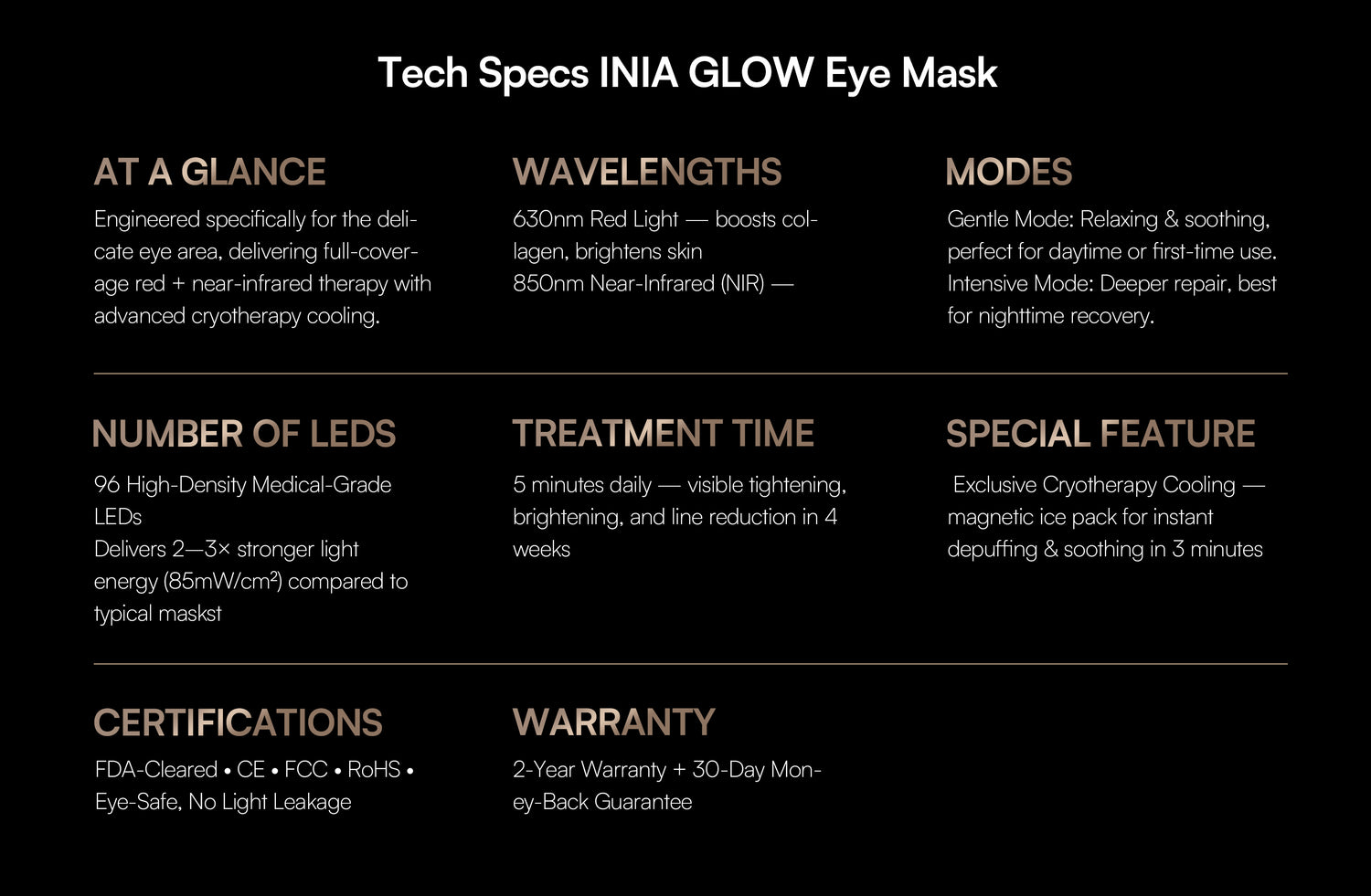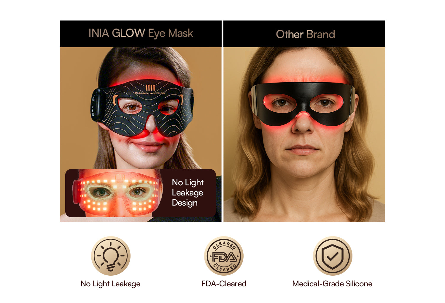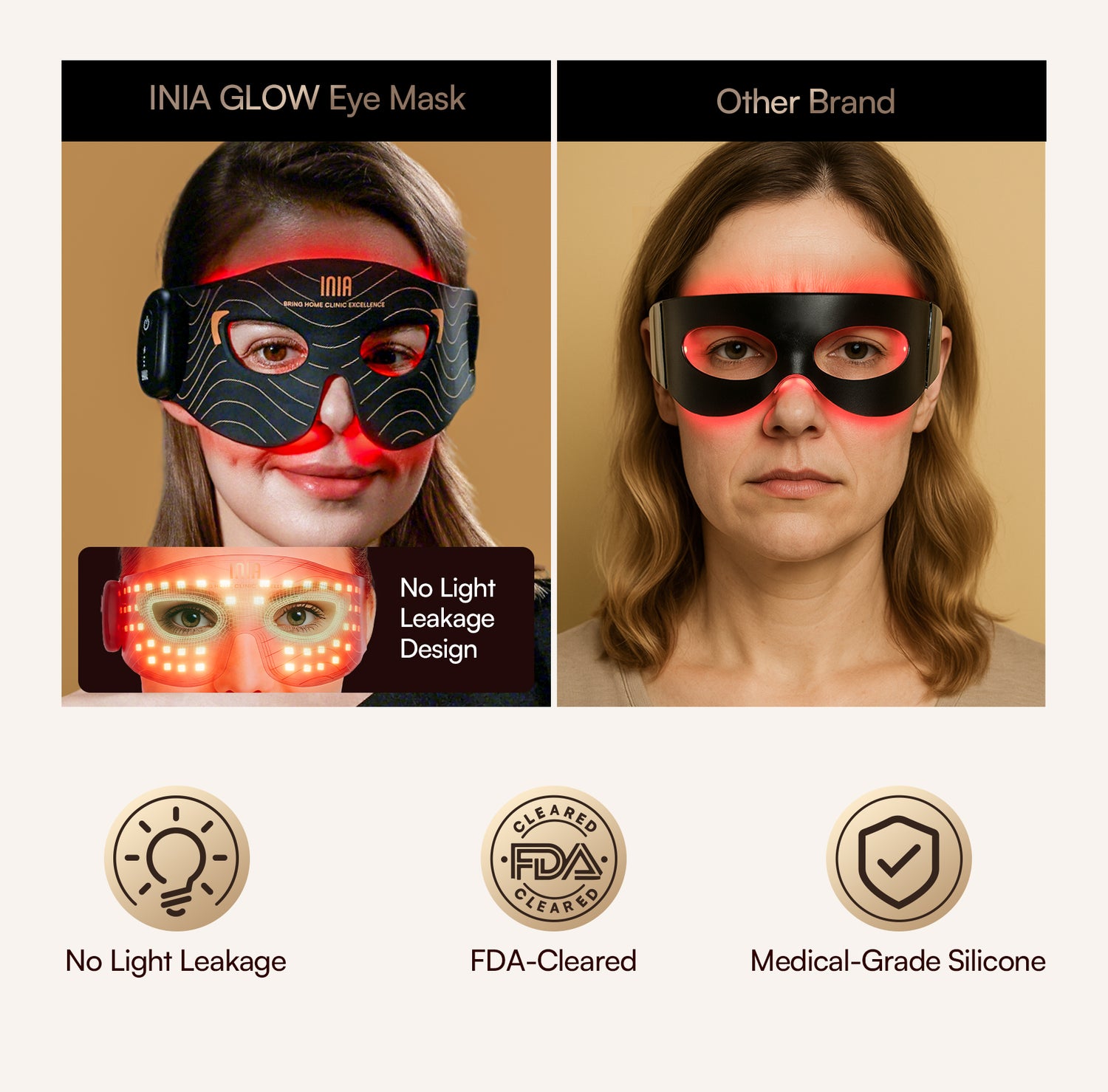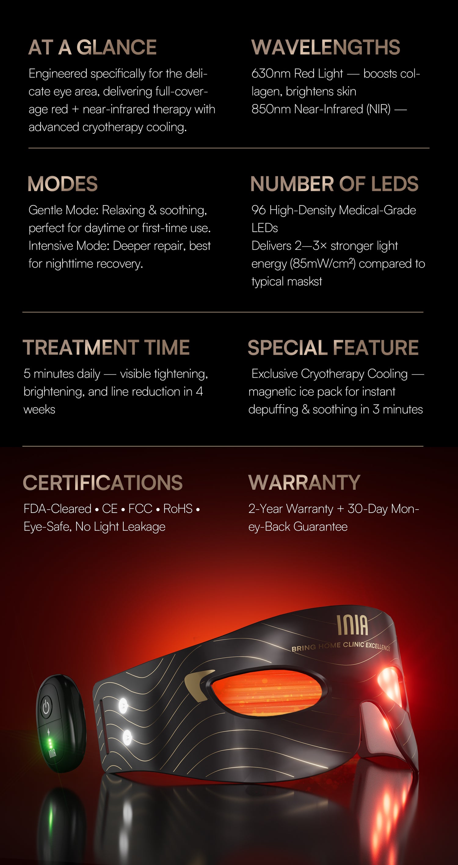 Most face masks miss the delicate eye area. INIA GLOW Eye Mask delivers full, high-density LED coverage exactly where you need it most.