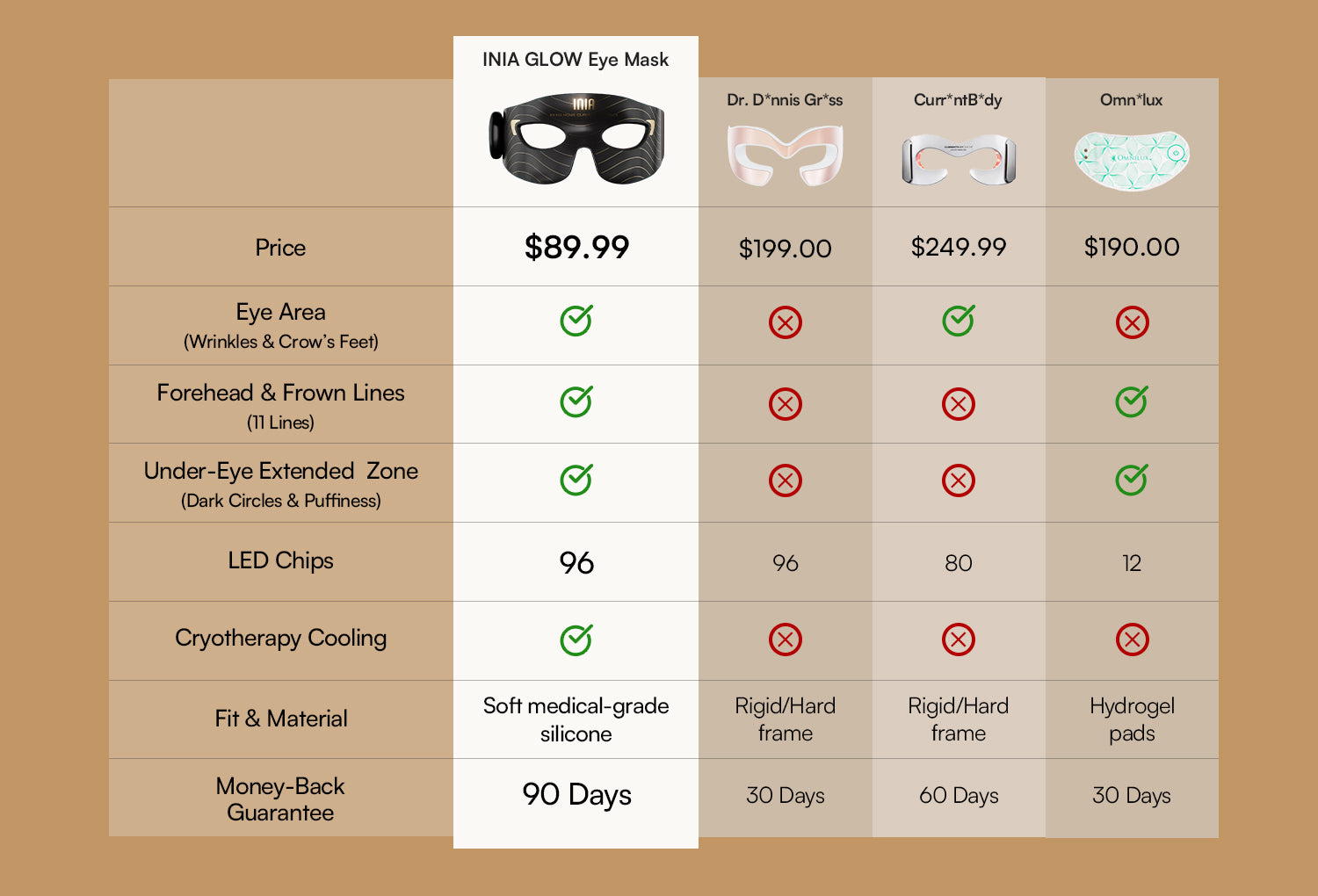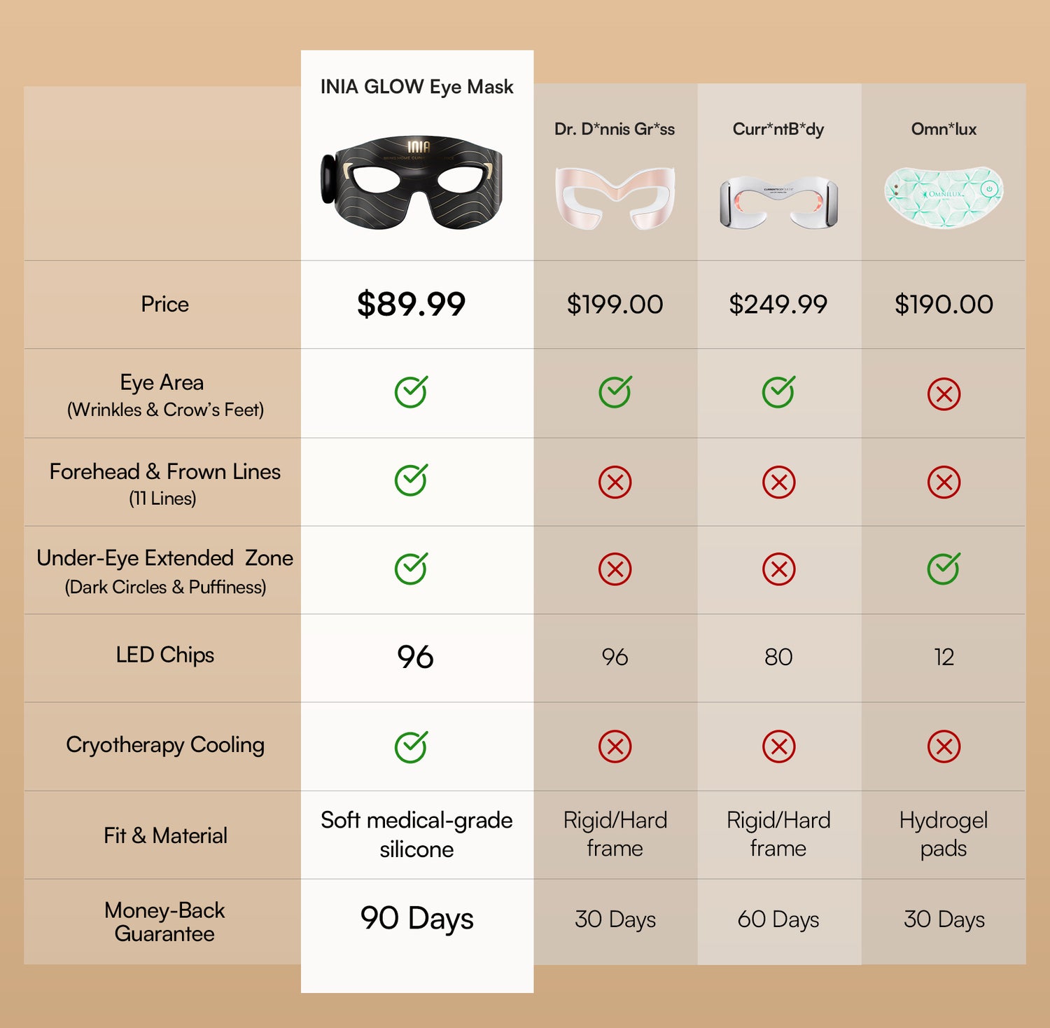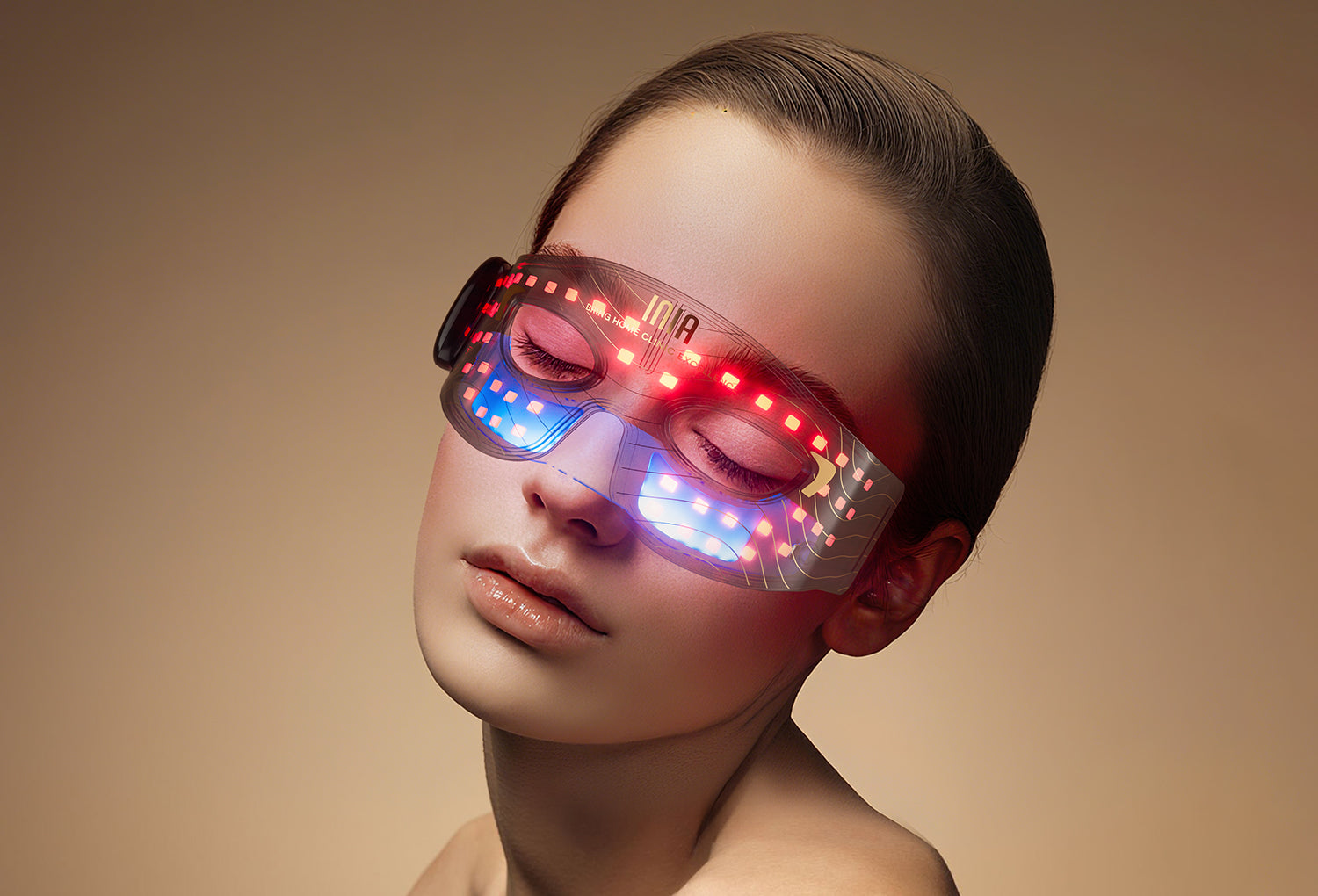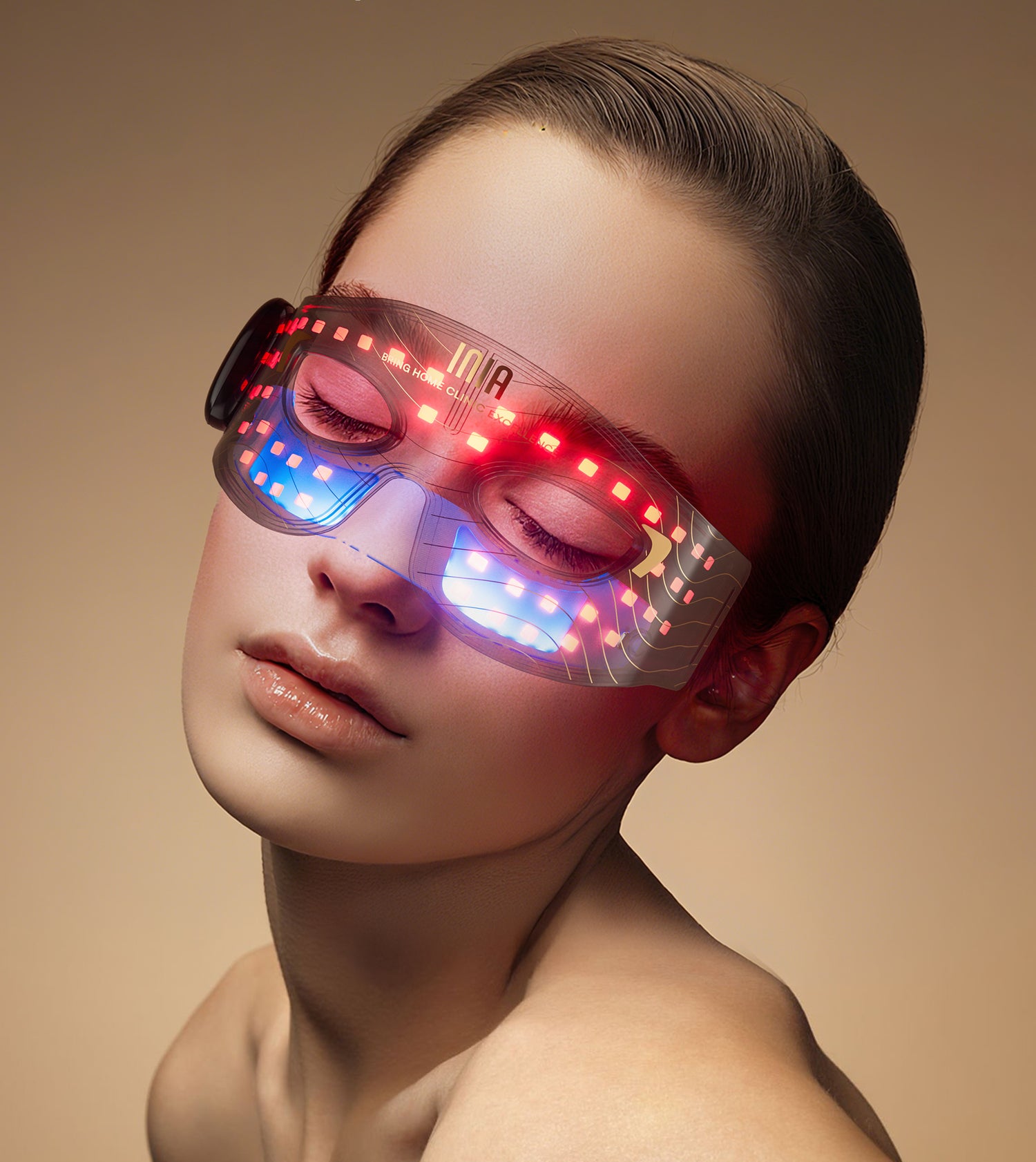 Most face masks miss the delicate eye area. INIA GLOW Eye Mask delivers full, high-density LED coverage exactly where you need it most.