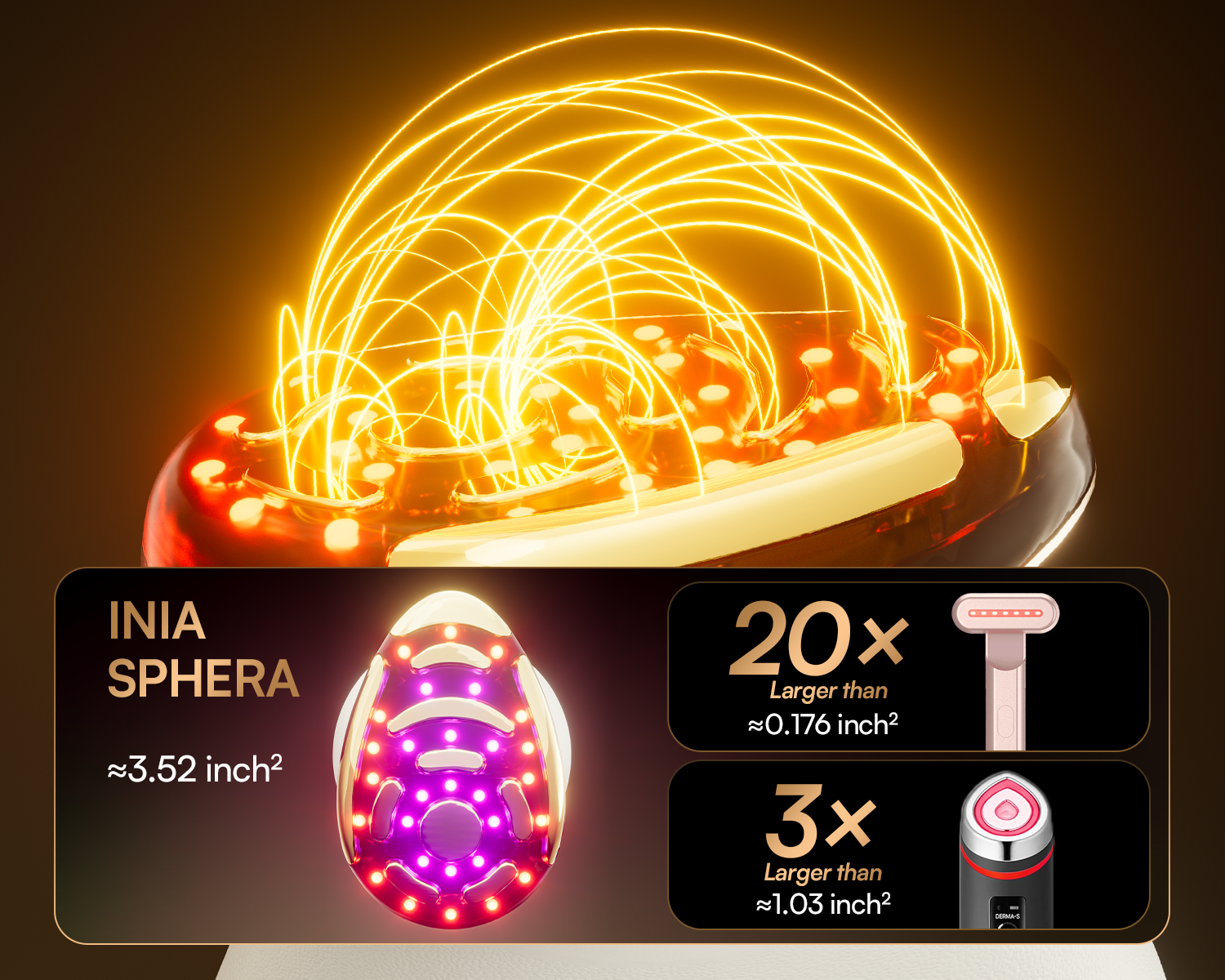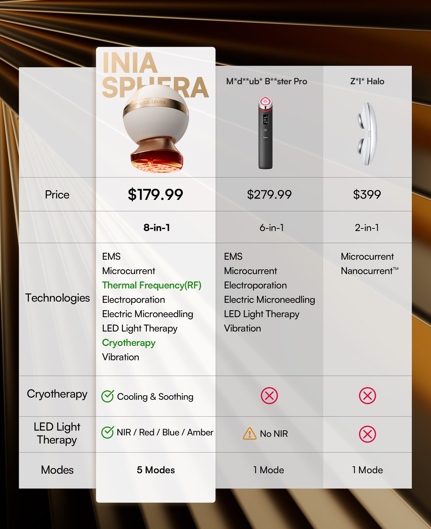 Other devices cost $300–$500 each for a single function. INIA SPHERA combines 8 clinic-grade technologies in one device—lift, tighten, refine pores, infuse, and soothe—delivering full-face, multi-layer care at a fraction of the price.