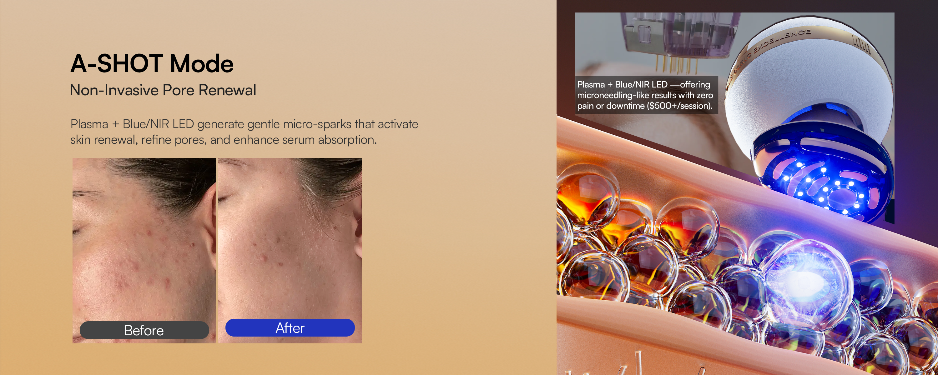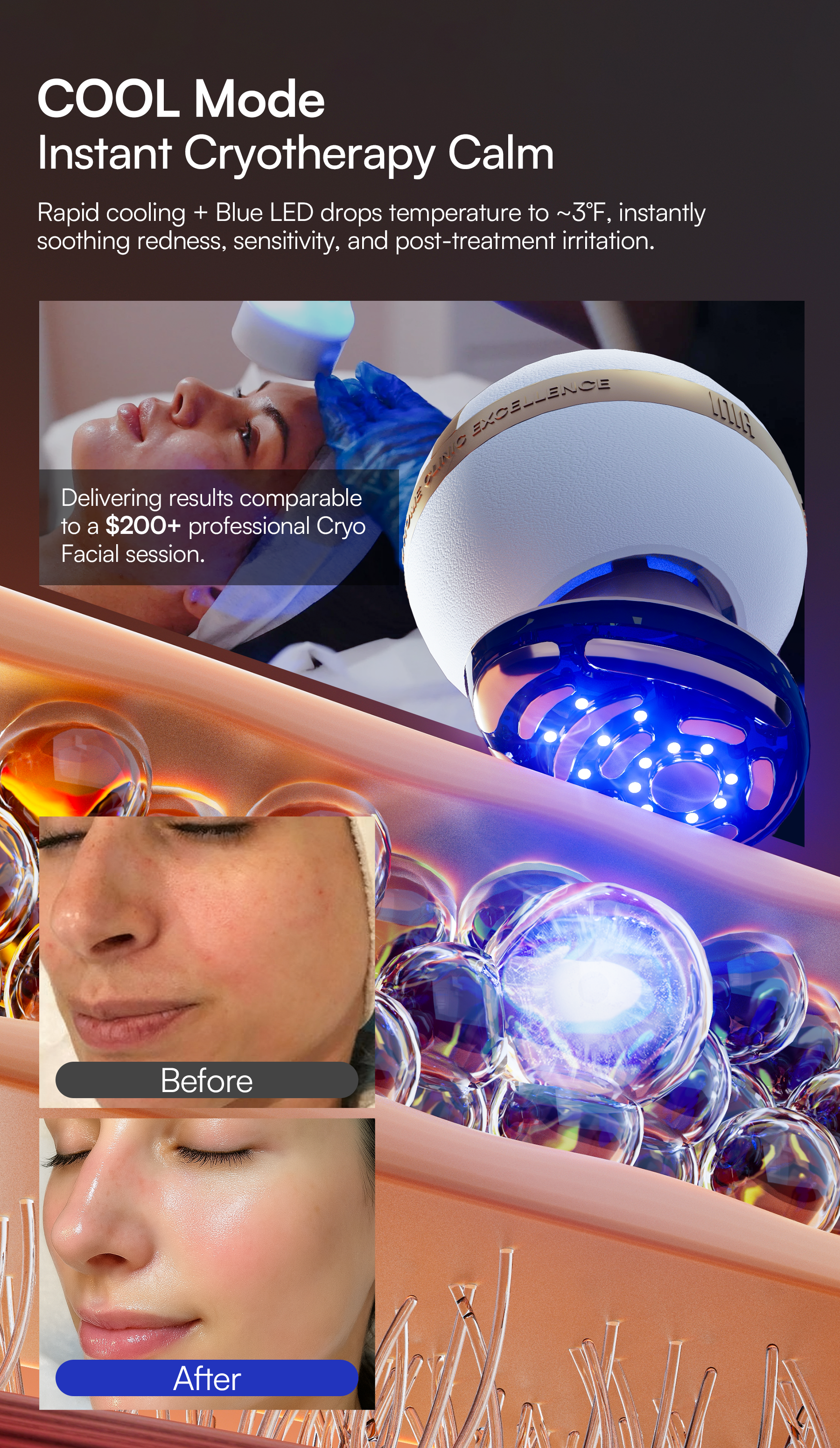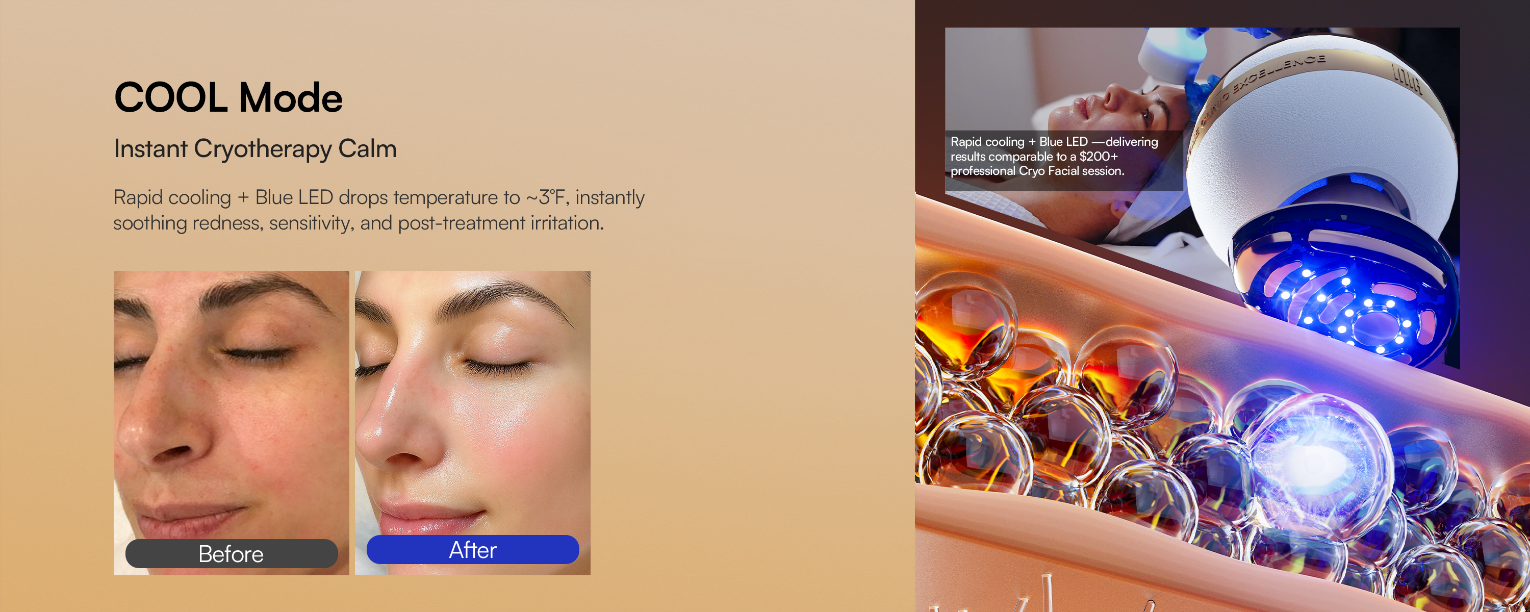 It's not a gimmick; it's the "professional closing step" that most at-home devices are missing. Professional clinic treatments (like RF or microneedling) almost always end with Cryotherapy. Our COOL mode (which chills to 15°C / 59°F) is designed to be used immediately afterLIFT, TIGHTEN, or A-SHOT. It instantly calms redness, soothes irritation, and helps shrink pores, completing a perfect "professional treatment loop.