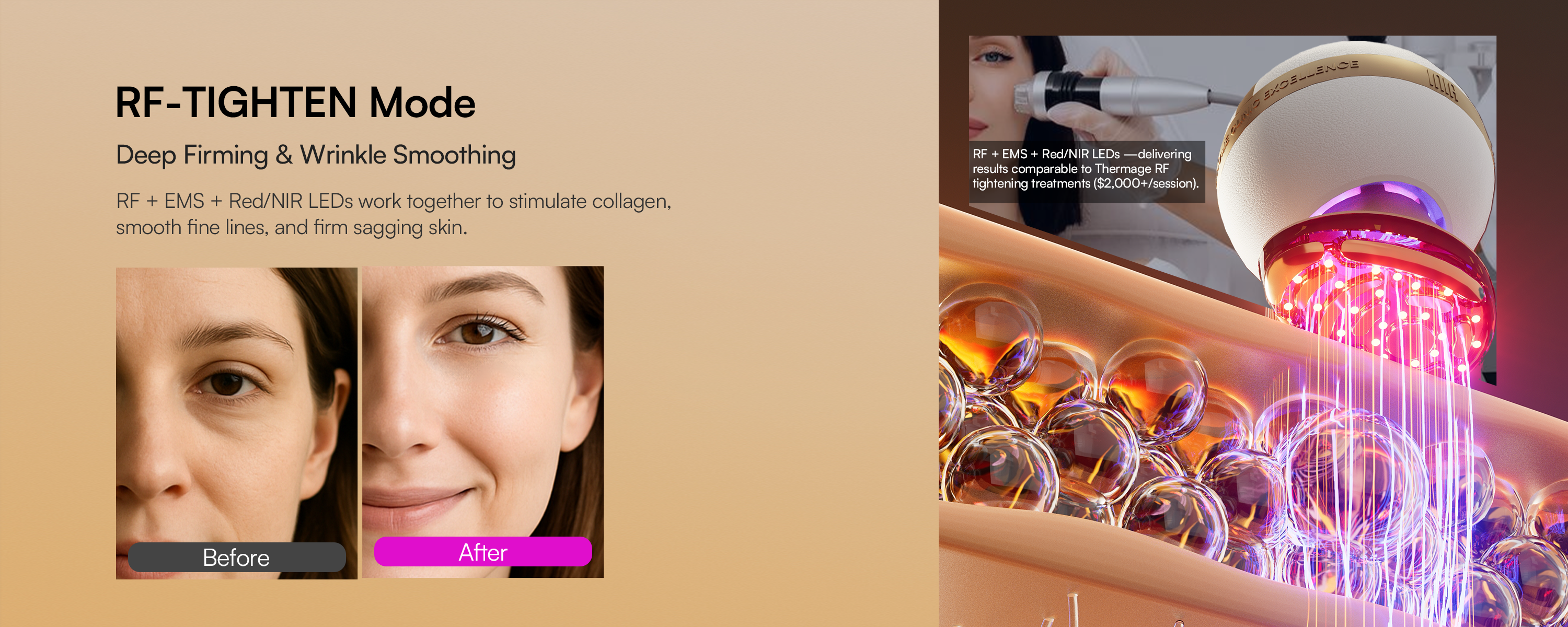 - TIGHTEN mode: This mode uses RF (Radiofrequency) and feels like a pleasant, warming sensation. It's very relaxing, like a warm stone massage, as it works deep to build collagen.