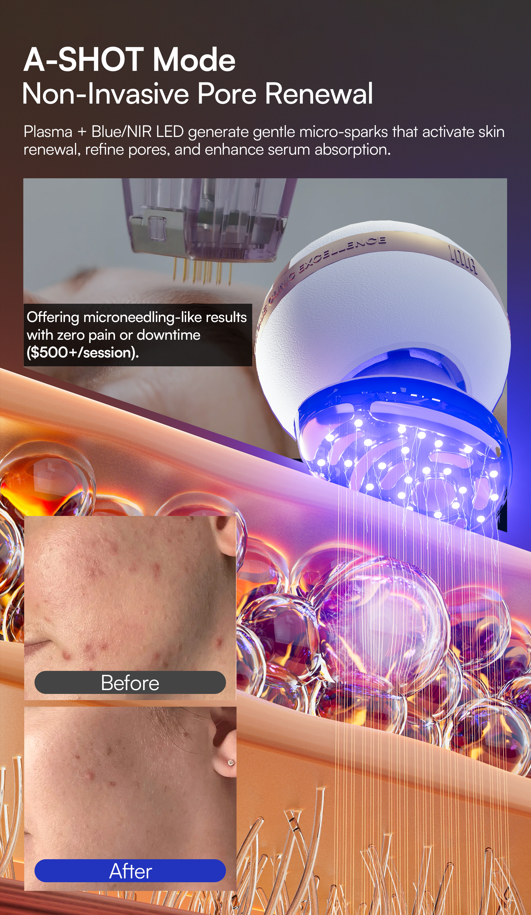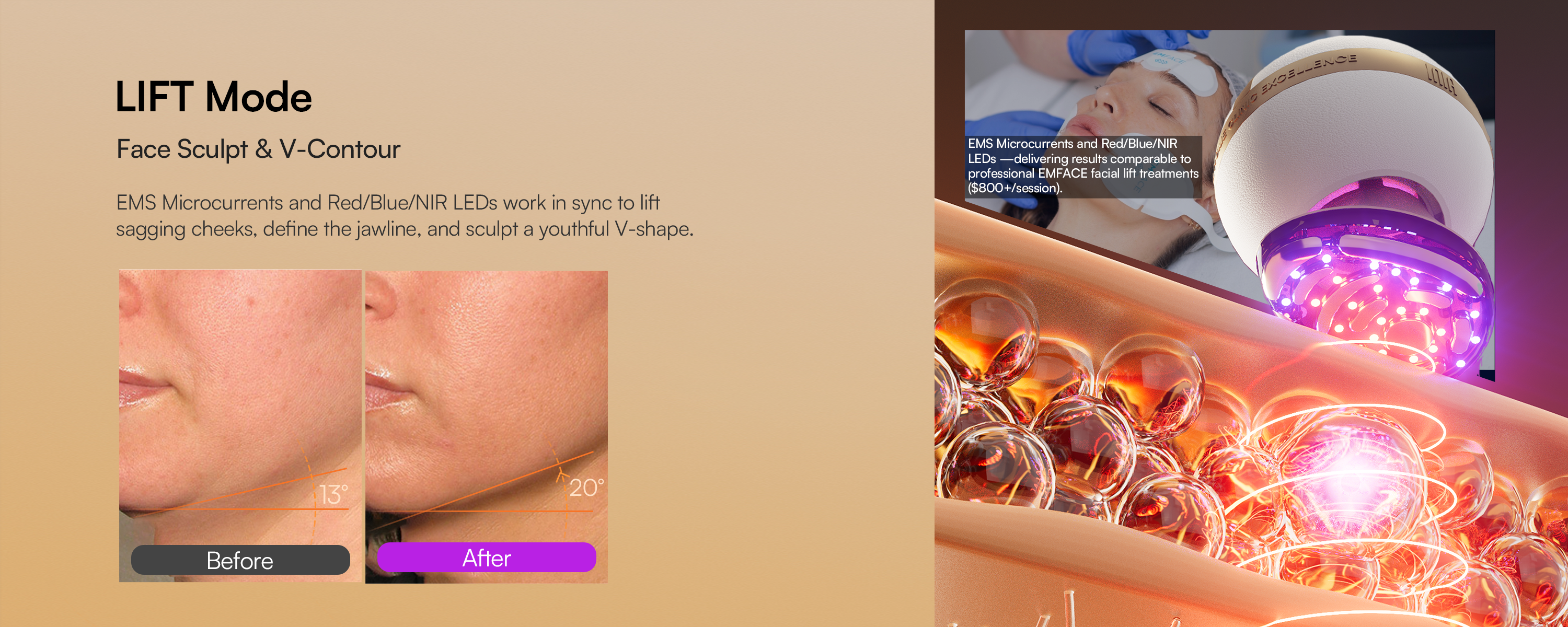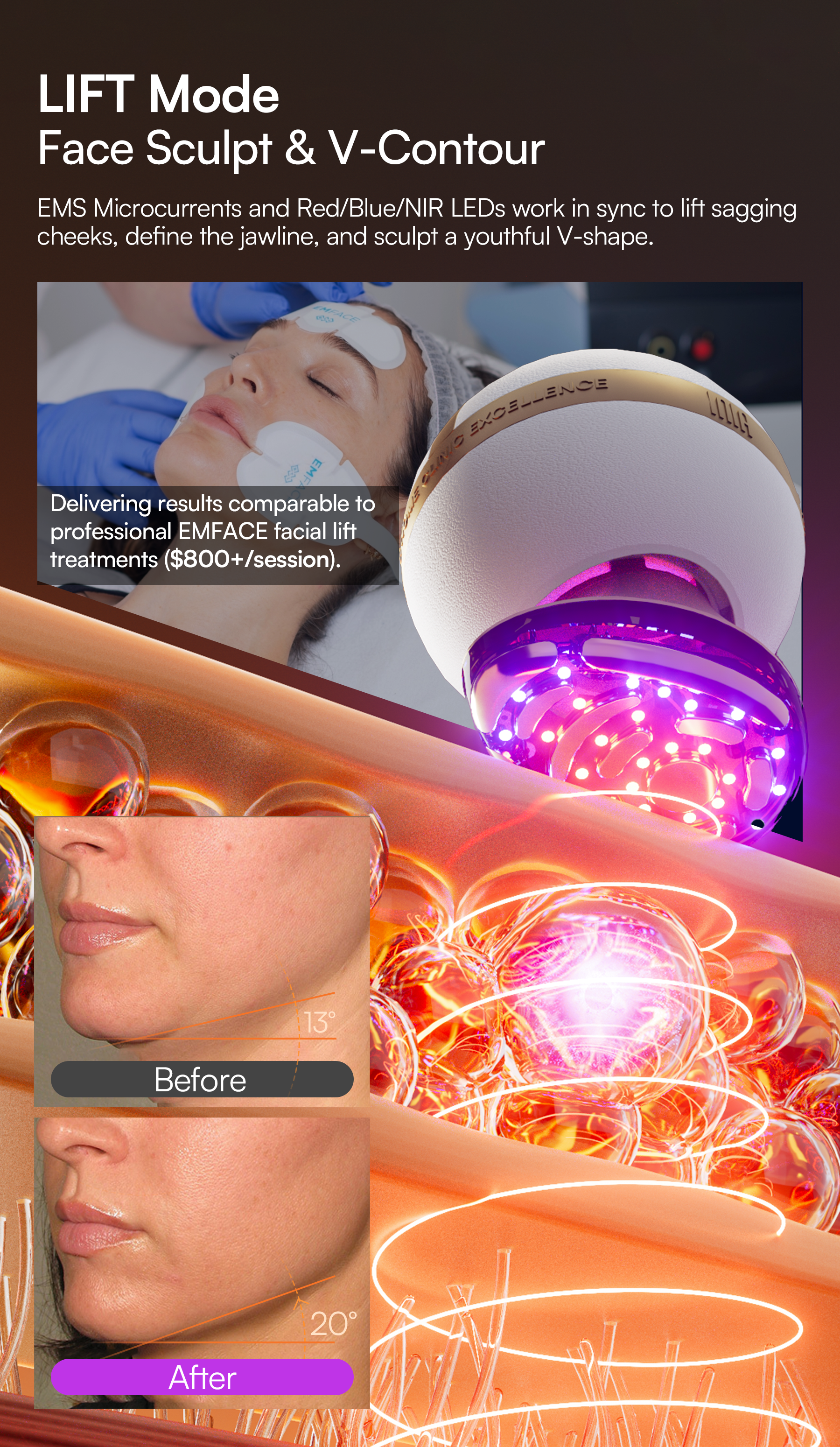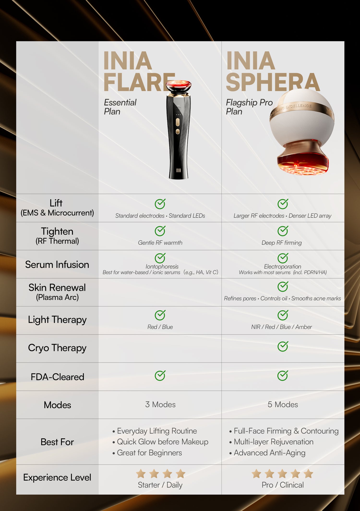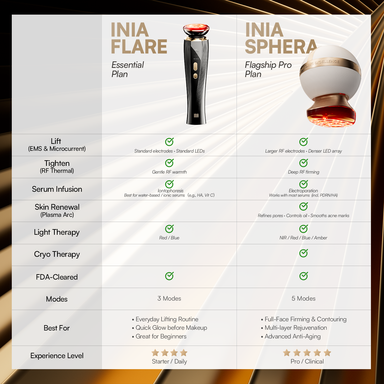 This is a great question. Think of FLARE as a focused "facial gym" for lifting. SPHERA is your entire "at-home clinic." It includes that same lifting technology, but adds professional-grade RF (Radiofrequency) for deep collagen rebuilding, Needle-Free Microneedling (A-SHOT) to refine pores, next-gen Electroporation (INFUSE) to push your serums deeper, and a Cryo-Therapy (COOL) mode to calm it all down. It’s a complete, systemic solution, not just a lifting tool.