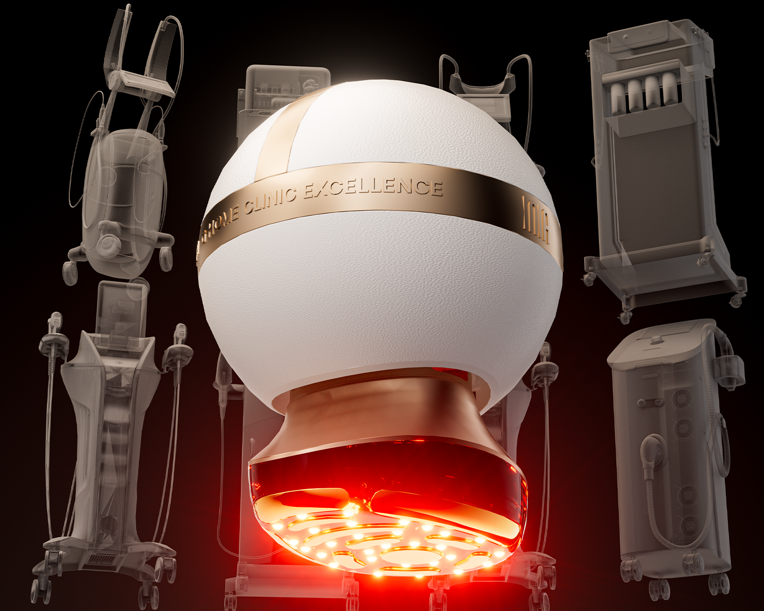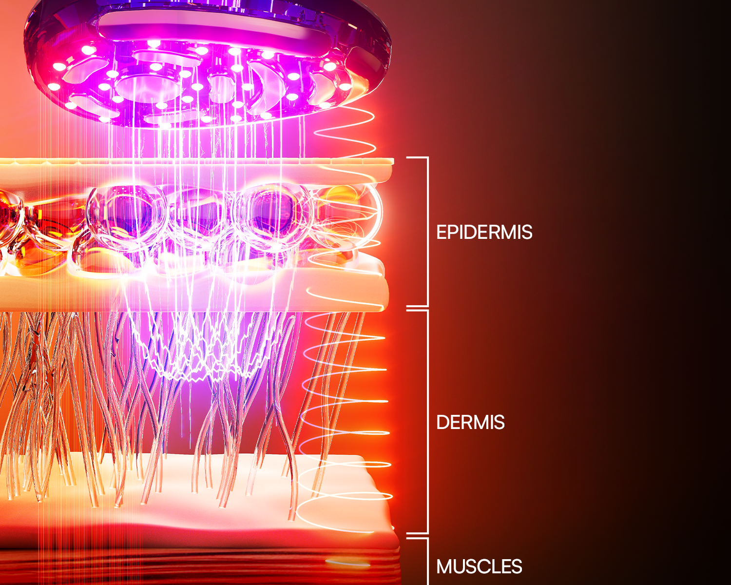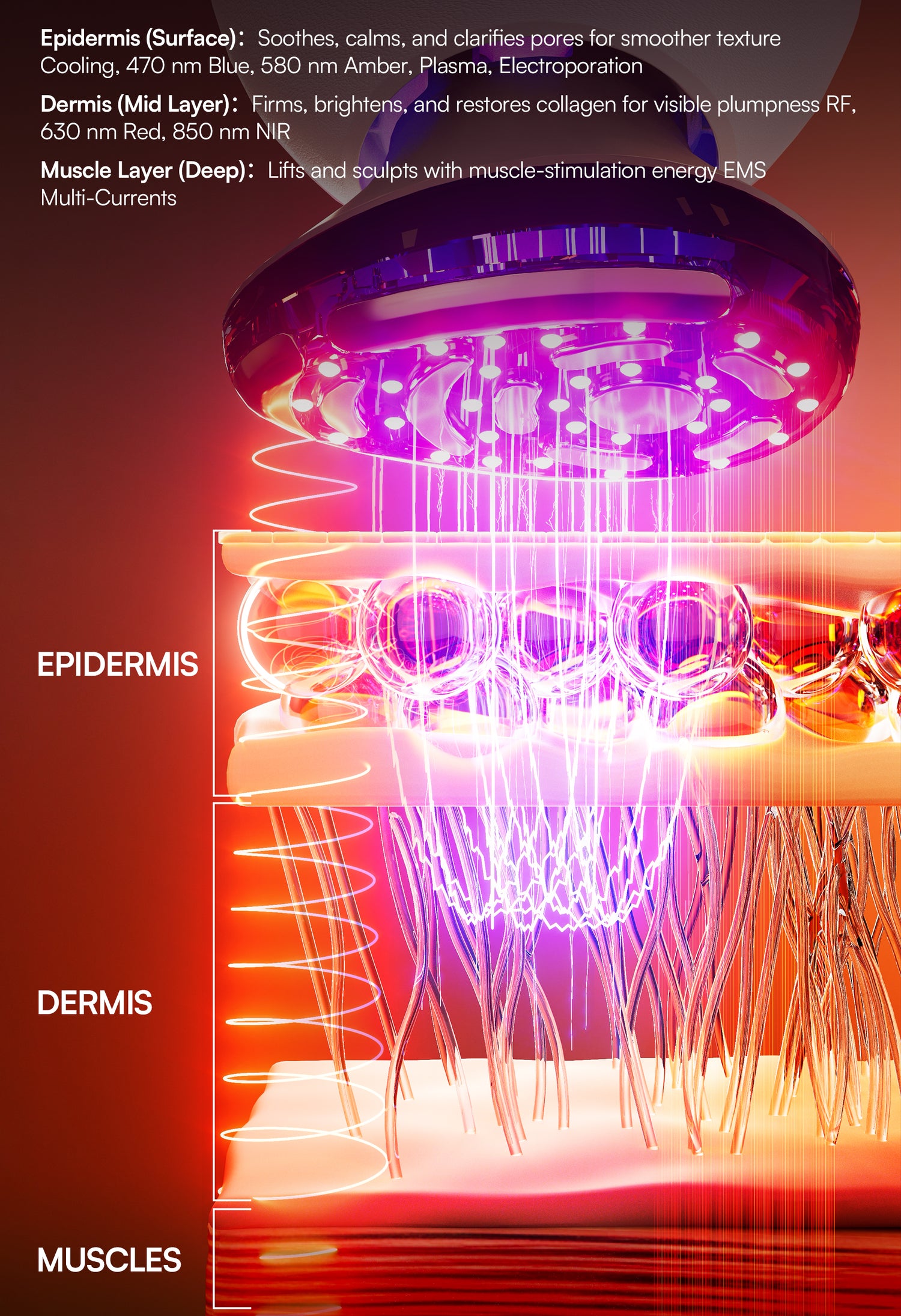 A synchronized RF + EMS + NIR energy circuit that revitalizes every layer — from surface to deep dermis.