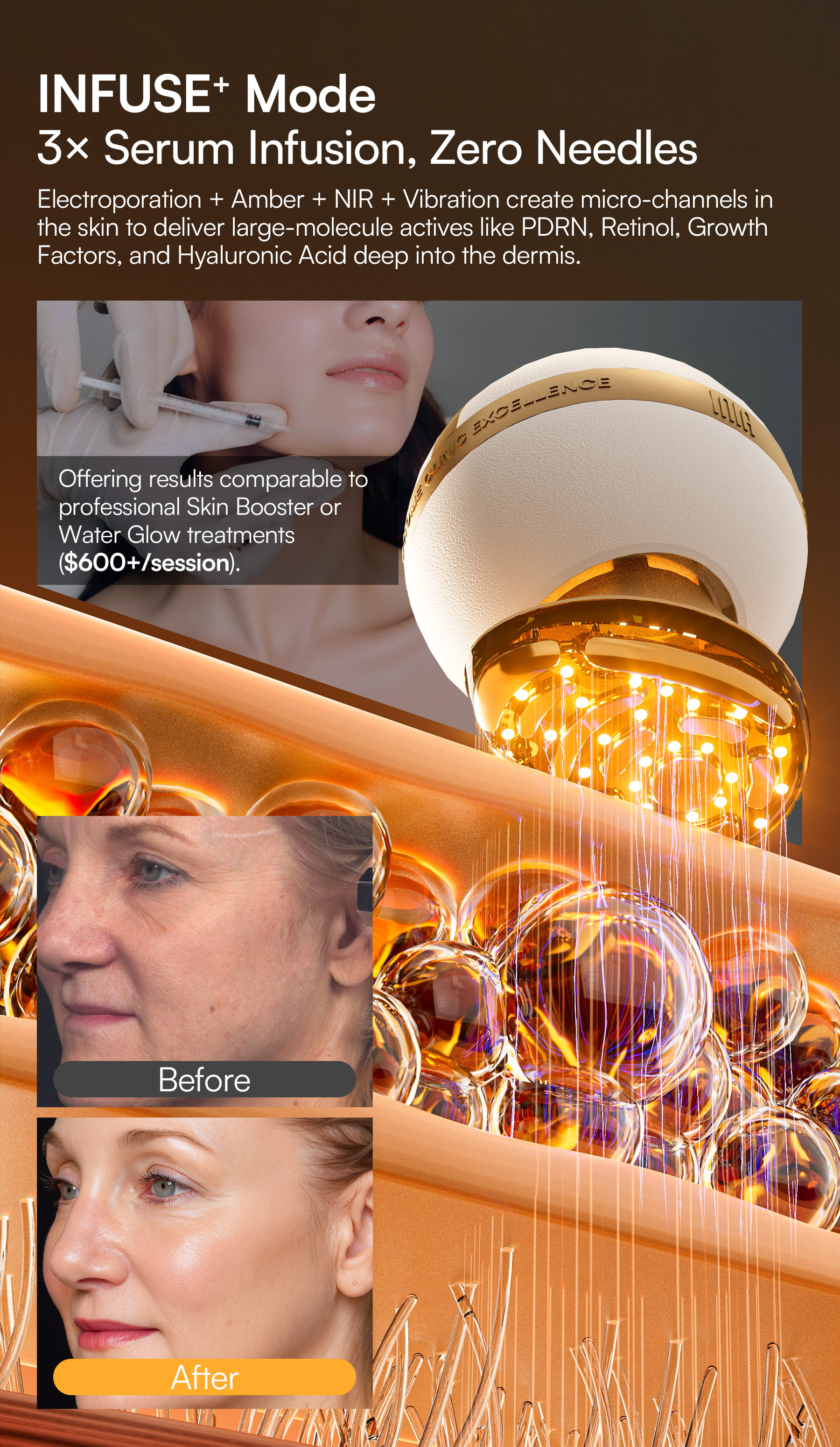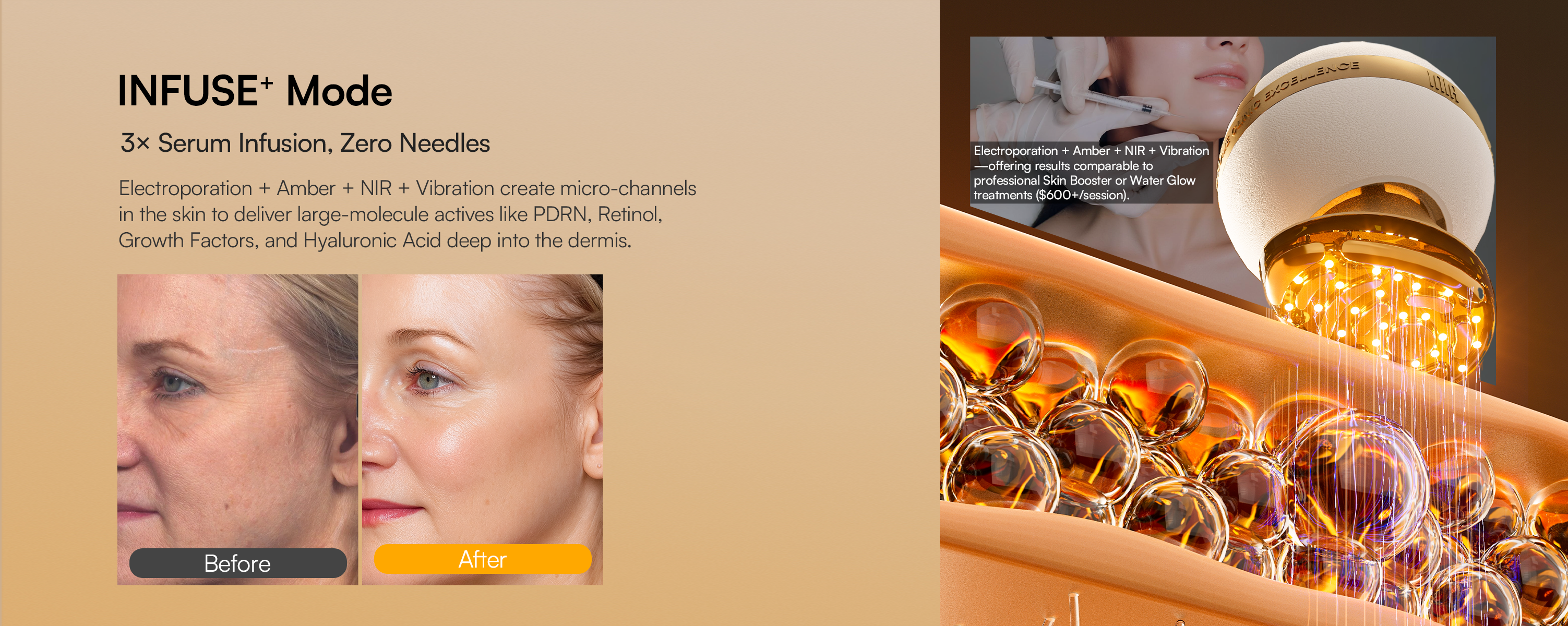 You do not! The INFUSE mode is "brand-agnostic," which is what makes it such a great investment. It is specifically engineered to work with your own favorite serums, especially those with powerful, large-molecule ingredients like Retinol, Peptides, or Hyaluronic Acid, making them work better.