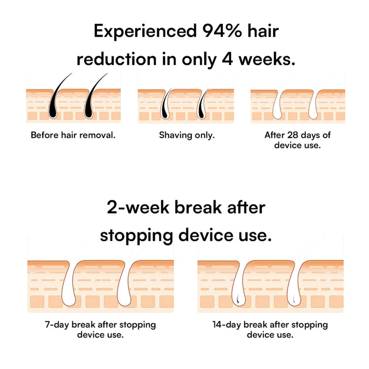 Results vary depending on skin and hair characteristics. We recommend conducting four bi-weekly treatments on the desired body area for optimal results. However, based on our observations, notable changes can be observed sooner. Once the initial four treatments are completed, you can continue to perform touch-up sessions as needed. This might involve treatments every 6-8 weeks, although some customers have reported being able to reduce touch-ups to twice a year over time.