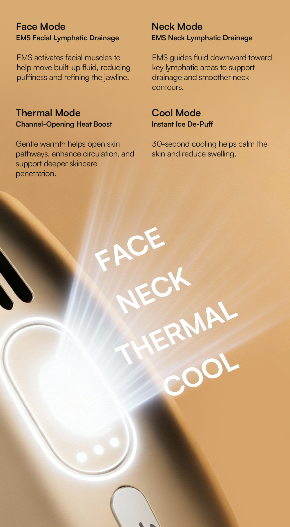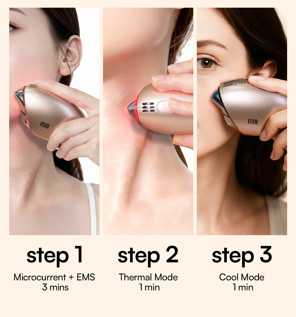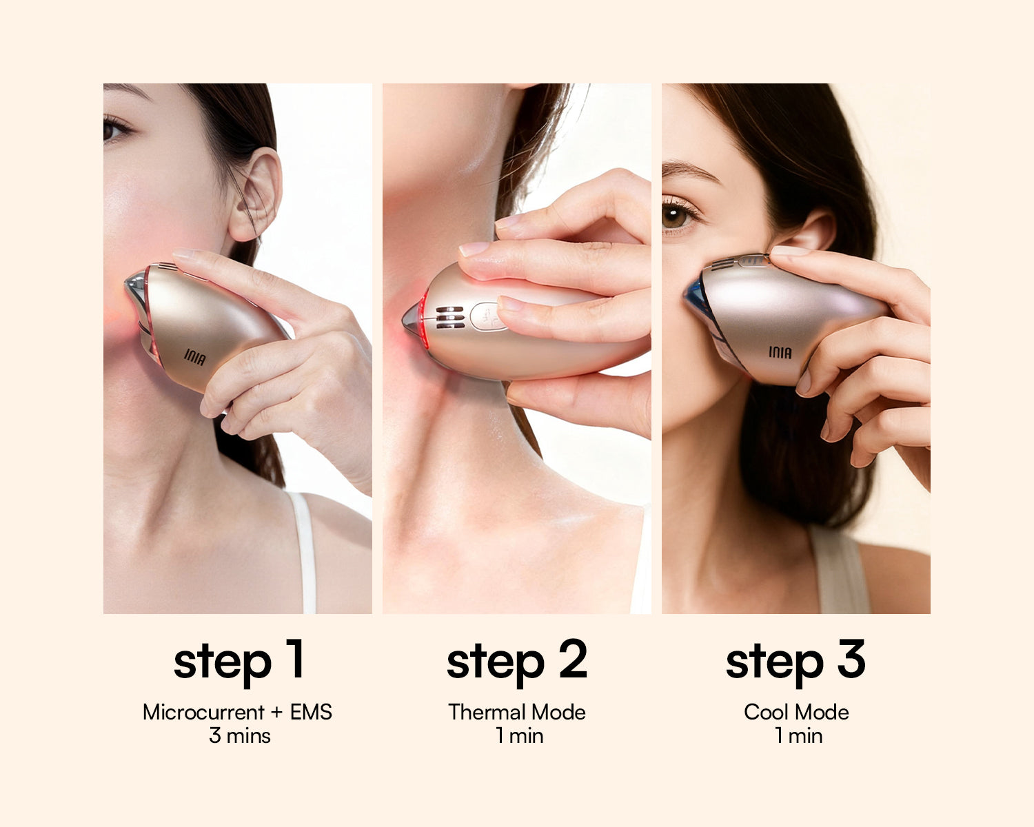 Powered by 7-in-1 Technology — EMS & Microcurrent, Red & Blue Light, Thermal & Cryo-Cool Therapy, and Vibration Massage — INIA GLACE integrates these into 4 targeted modes (Face Lift, Neck Firm, Thermal Infusion, Cool De-Puff) for visible improvements:
