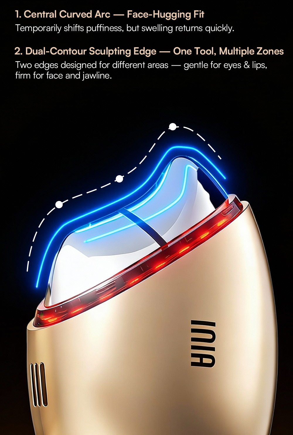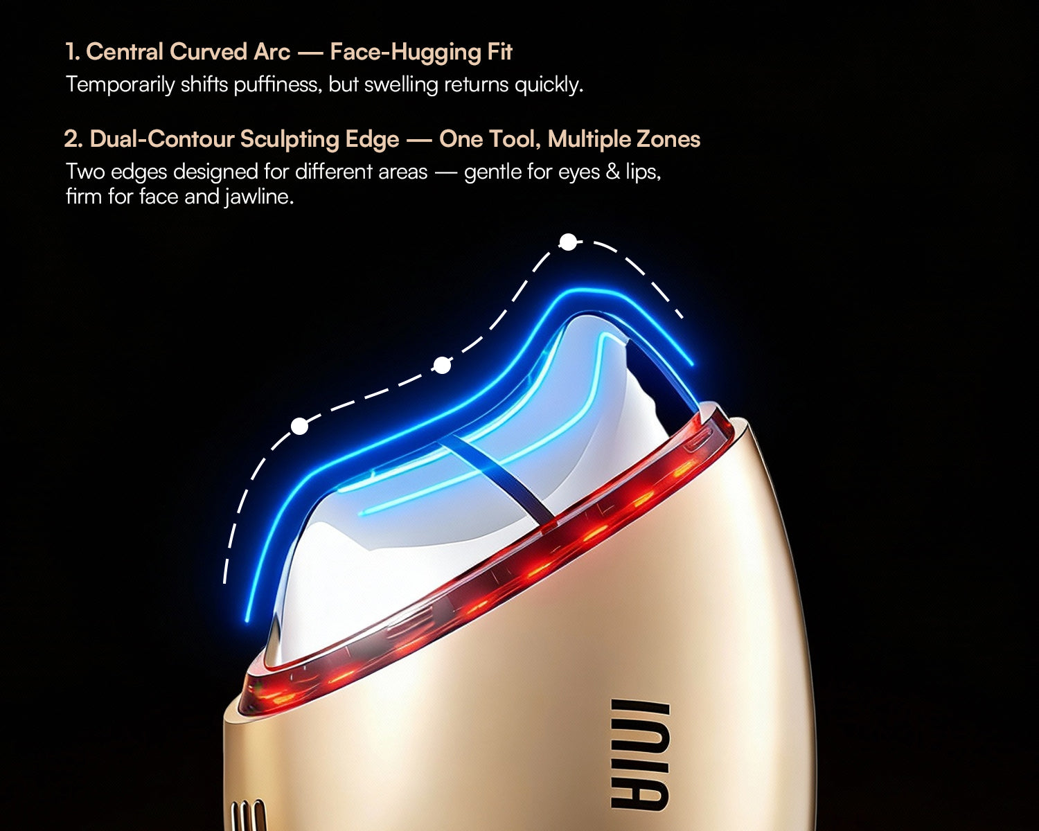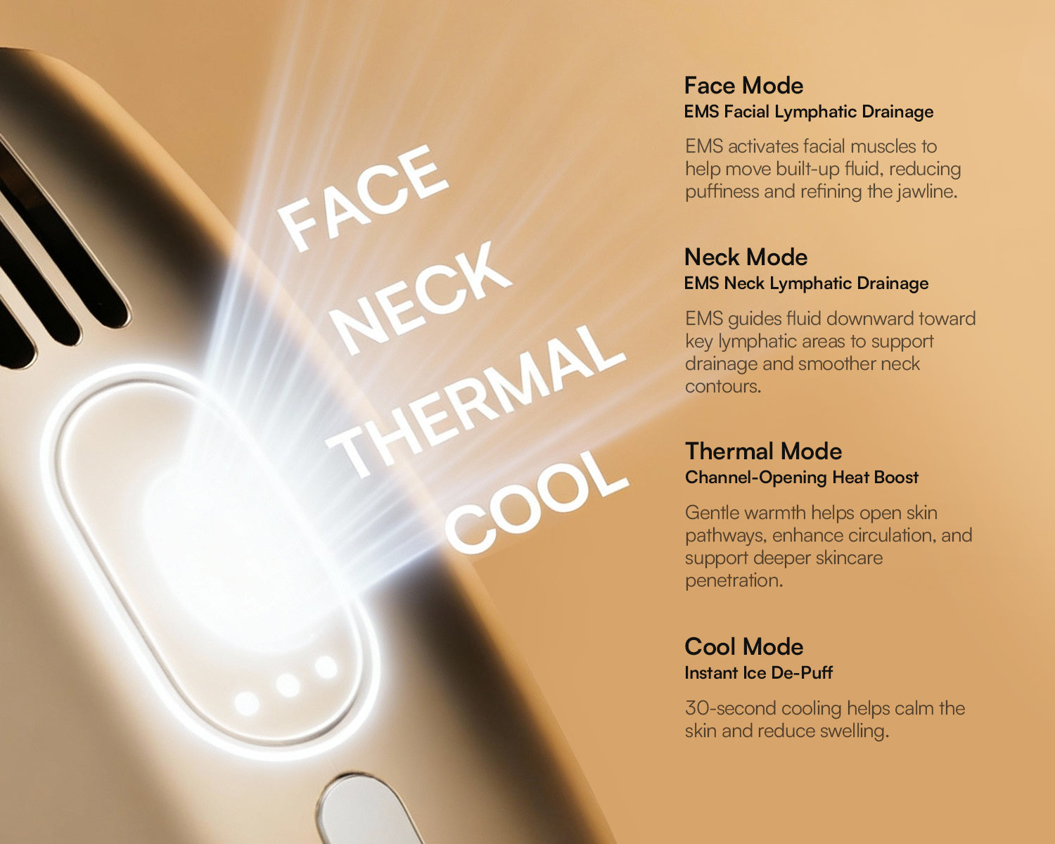 Powered by 7-in-1 Technology — EMS & Microcurrent, Red & Blue Light, Thermal & Cryo-Cool Therapy, and Vibration Massage — INIA GLACE integrates these into 4 targeted modes (Face Lift, Neck Firm, Thermal Infusion, Cool De-Puff) for visible improvements: