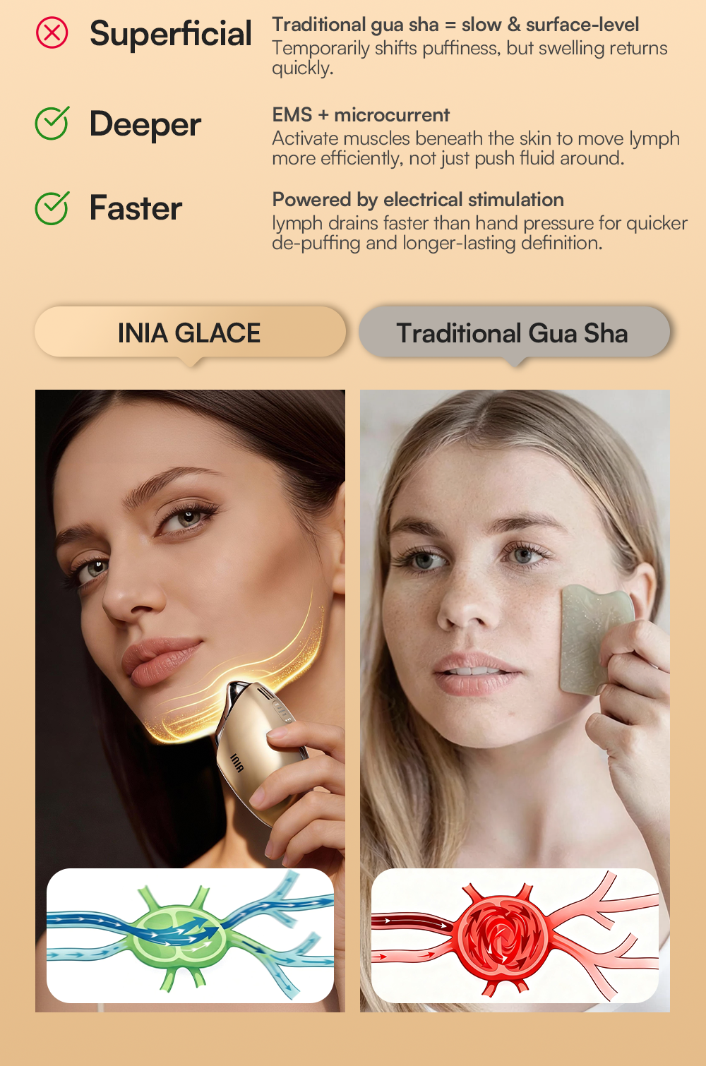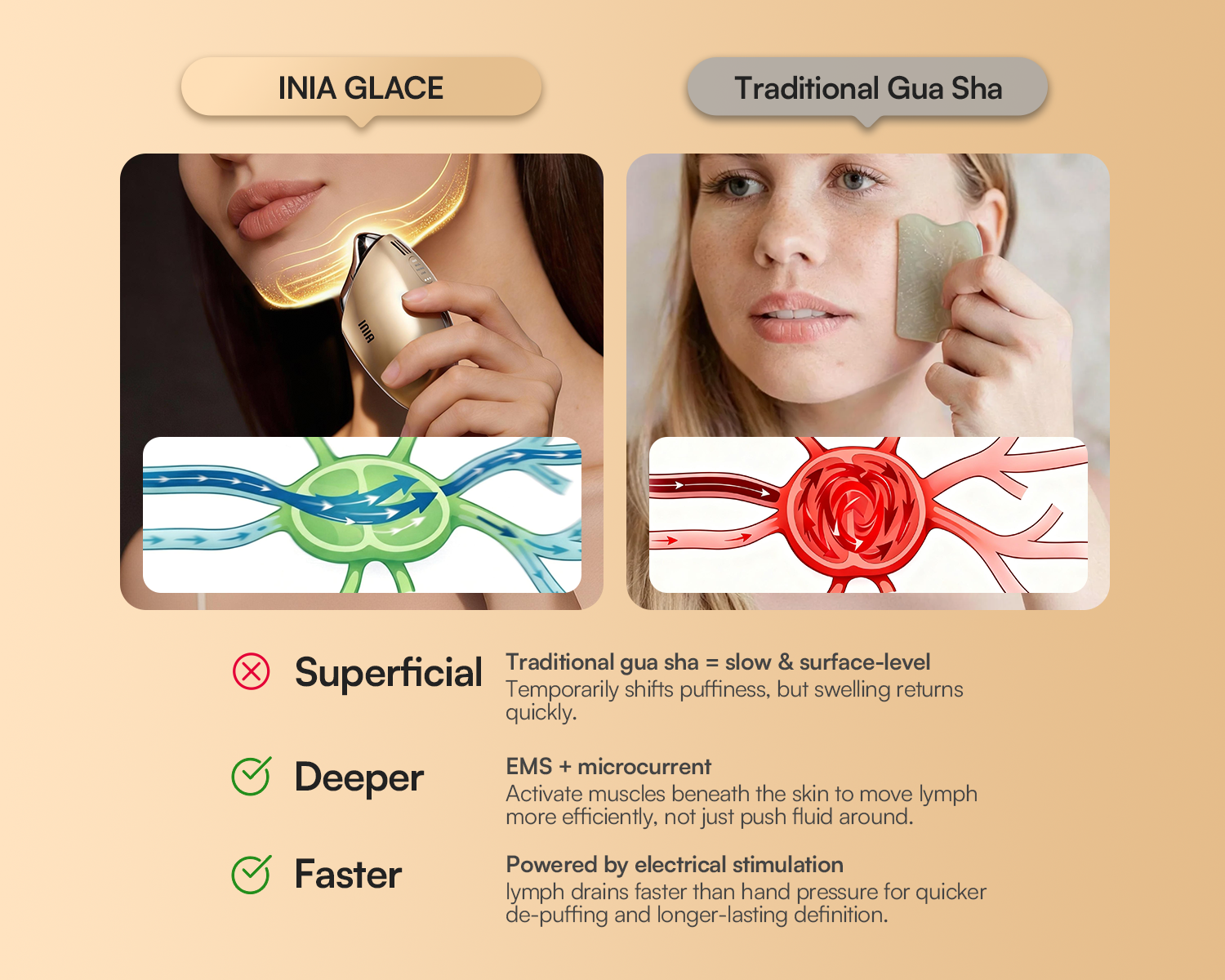 The INIA GLACE enhances a traditional Gua Sha with modern technology like EMS, Microcurrent, Red & Blue LED Therapy, Thermal Therapy, Cryotherapy and Vibration. It integrates 7 functions to sculpt and revitalize skin far beyond a simple stone.