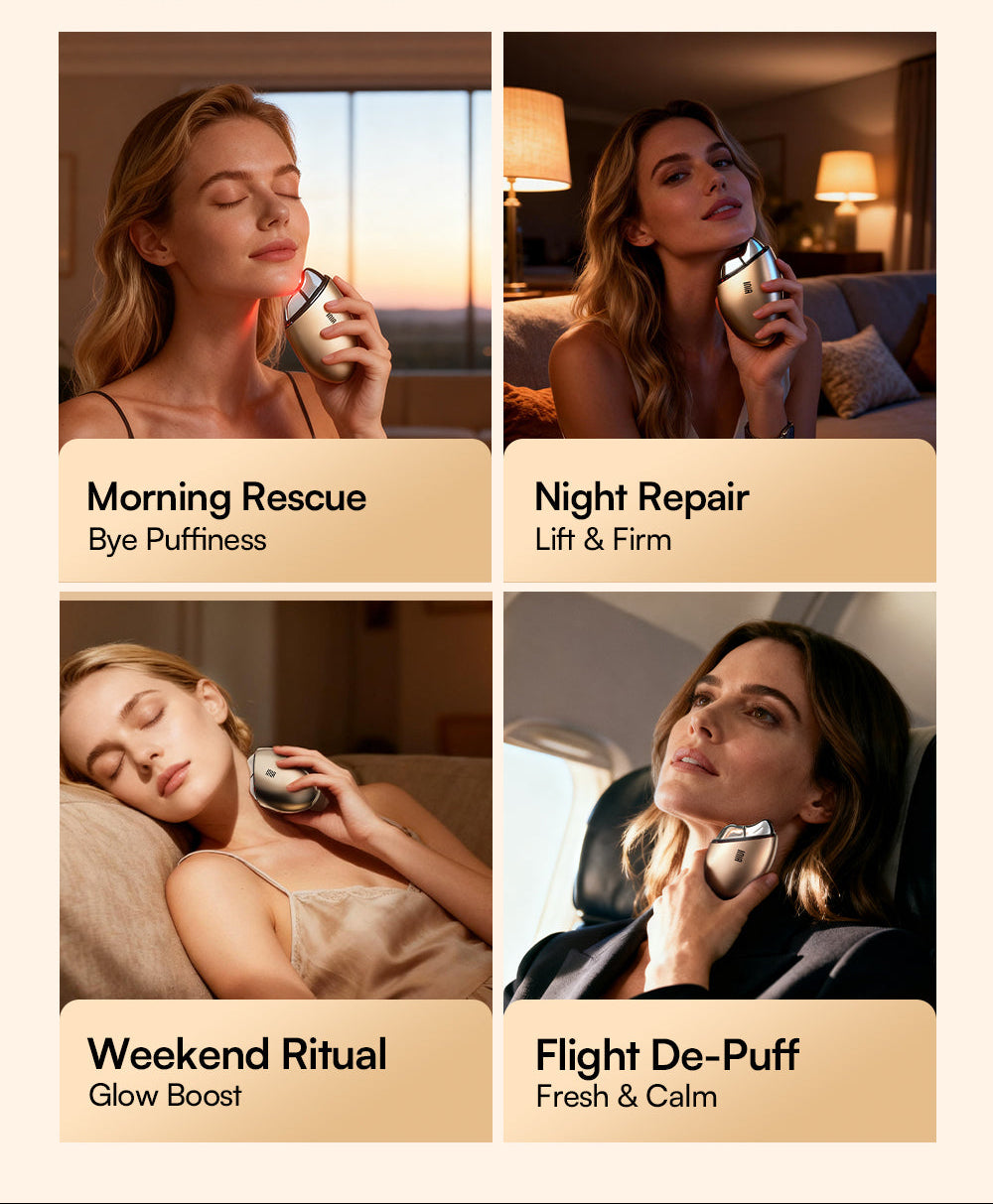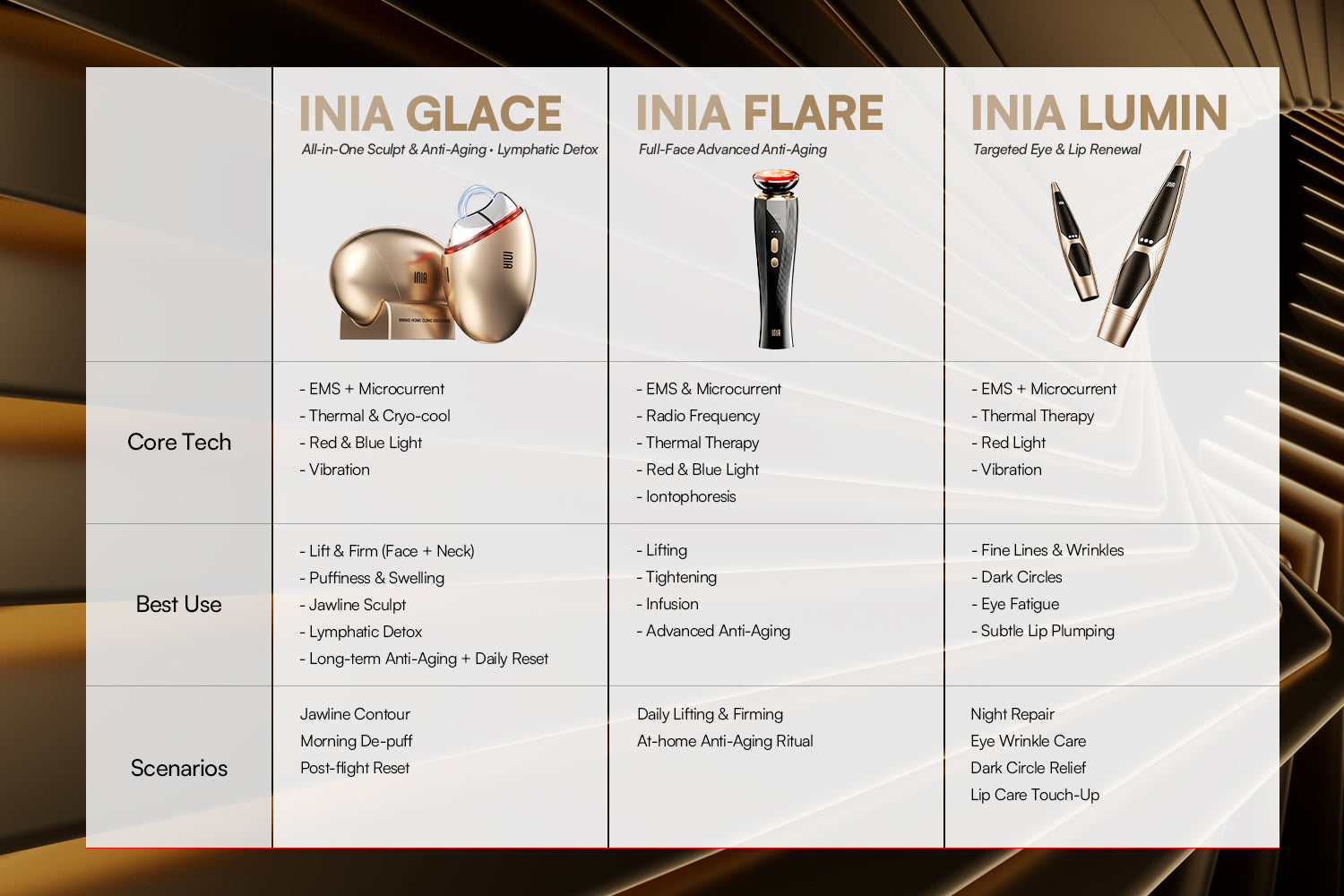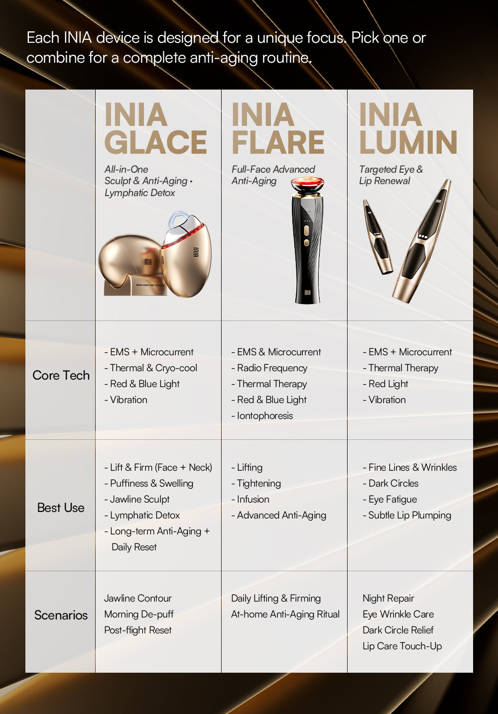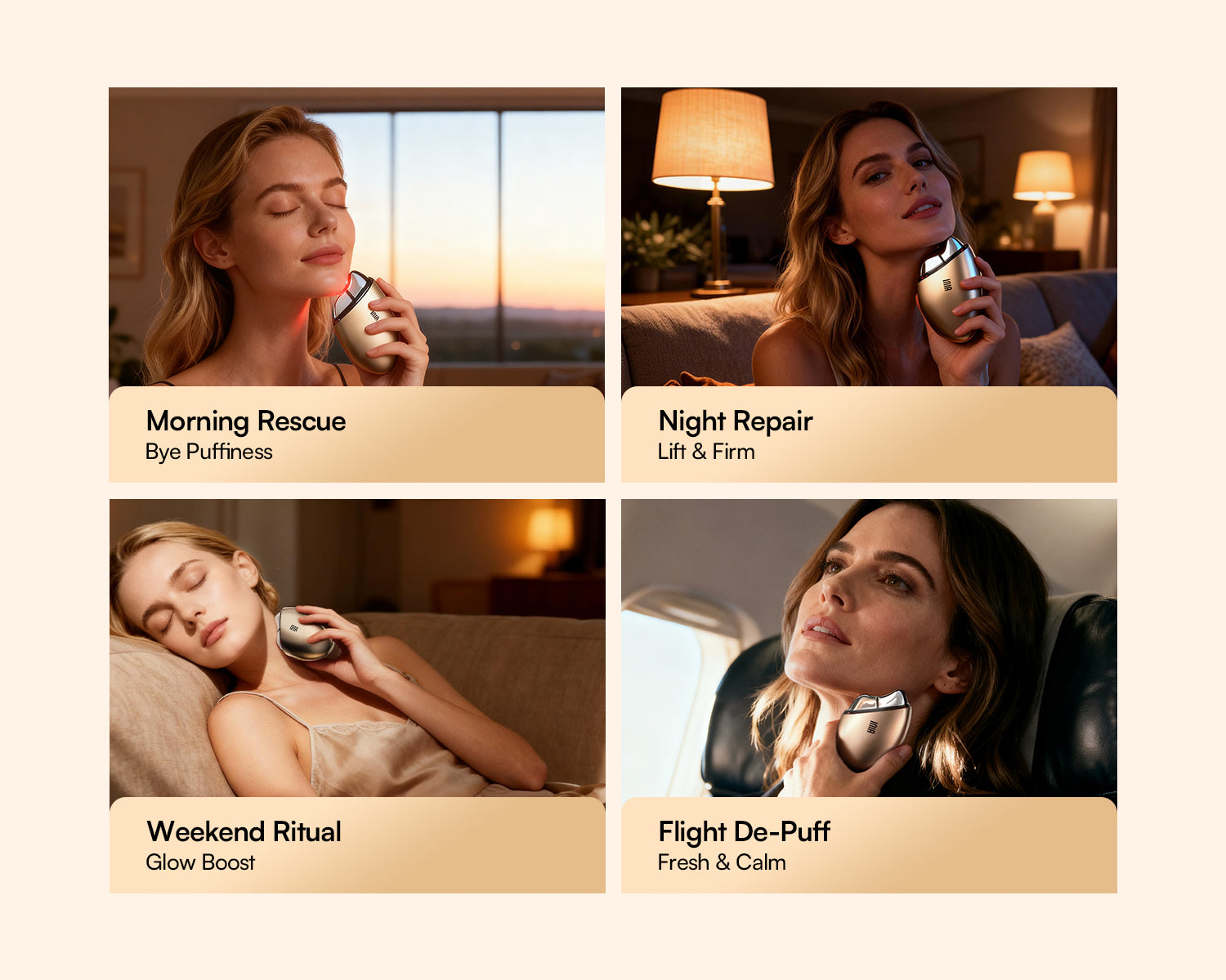 From morning de-puff in 30s, to nightly lift & firm,to weekend spa glow and post-flight refresh - INIA GLACE covers every need with one device.