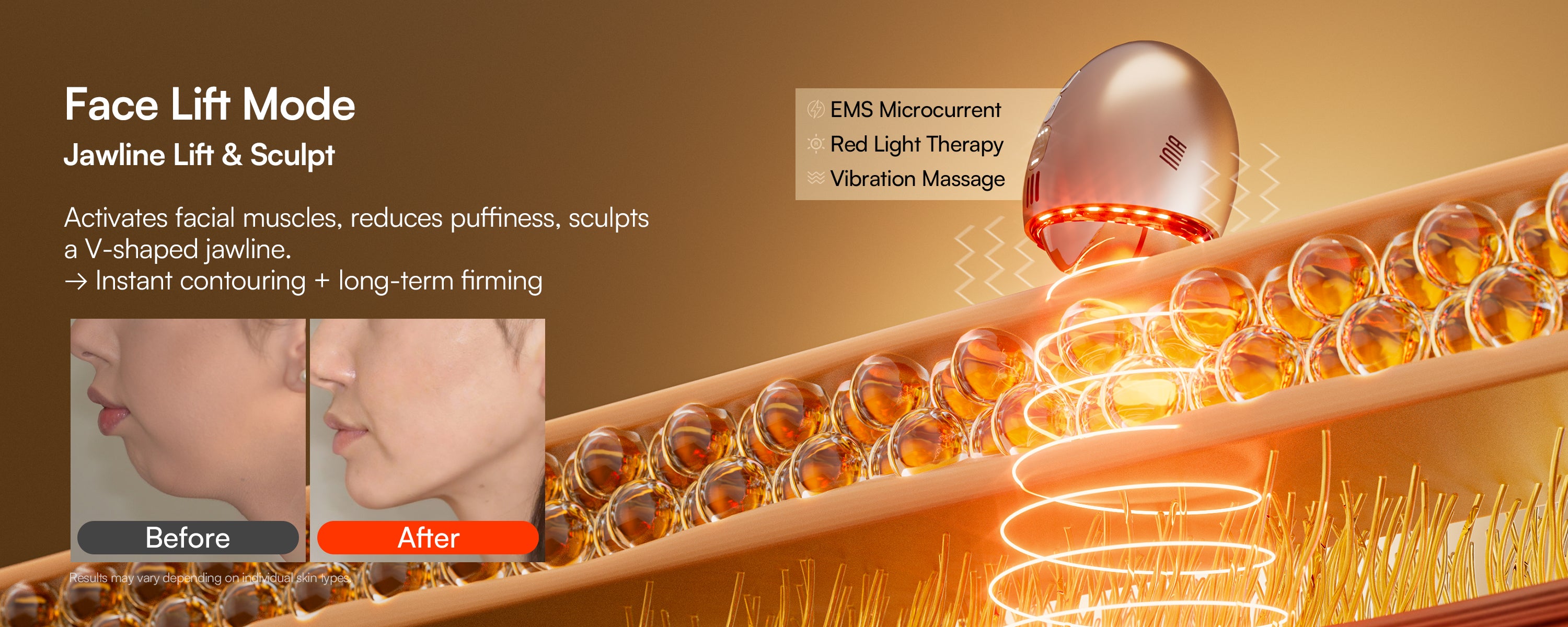 This mode uses microcurrent, red light, and vibration to energize and tone facial muscles. This combination helps reduce swelling and sculpts the jawline for a more defined V-face look.