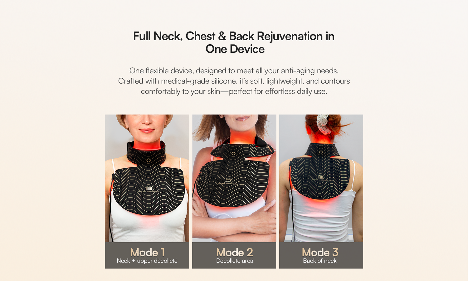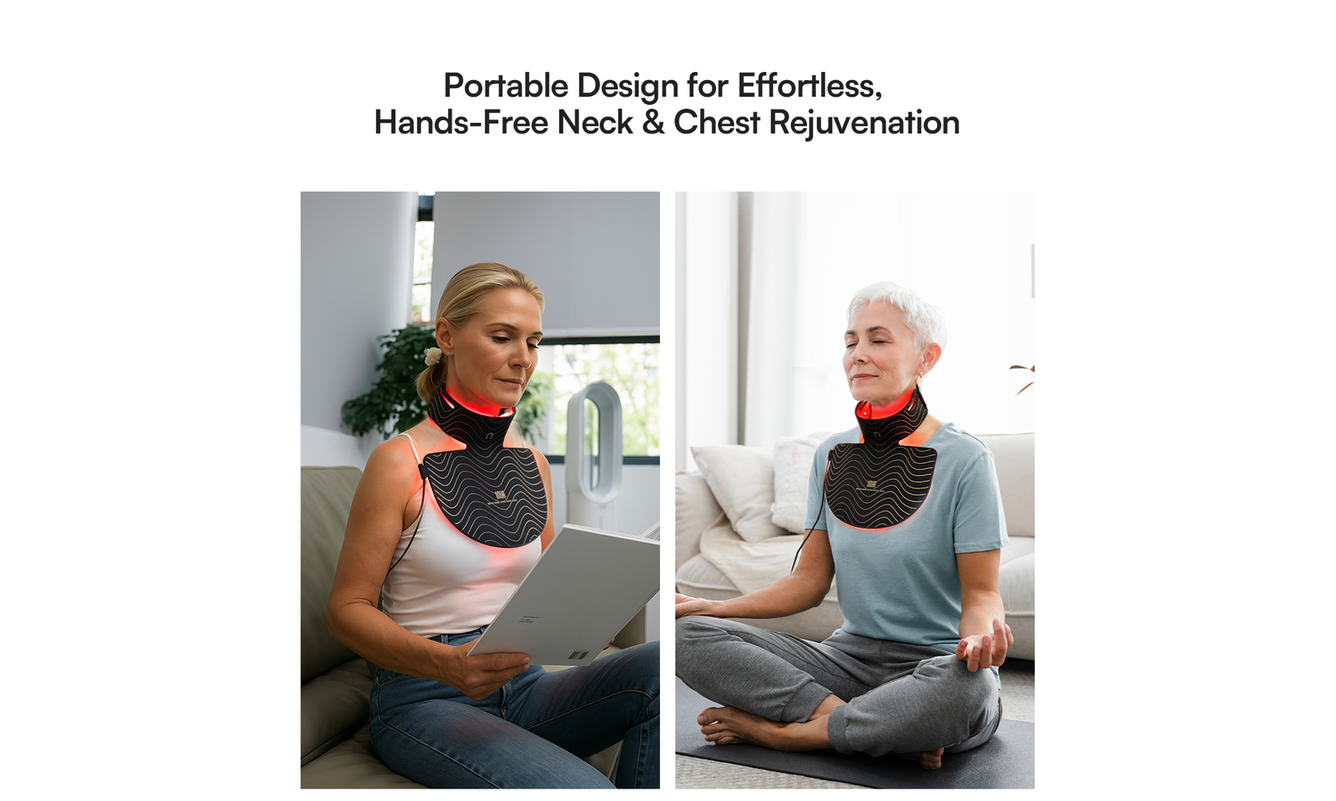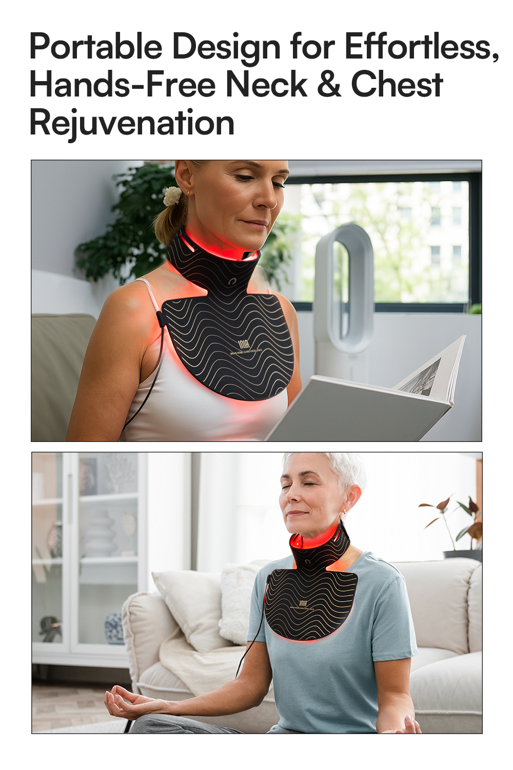 Our dual-wavelength technology (630nm red and 850nm NIR) works at a cellular level, penetrating up to 2x deeper. This synergy helps stimulate collagen-rich, firmer skin, reduces fine lines, and supports overall skin renewal for a smoother, younger-looking appearance in areas often neglected by traditional face masks.
