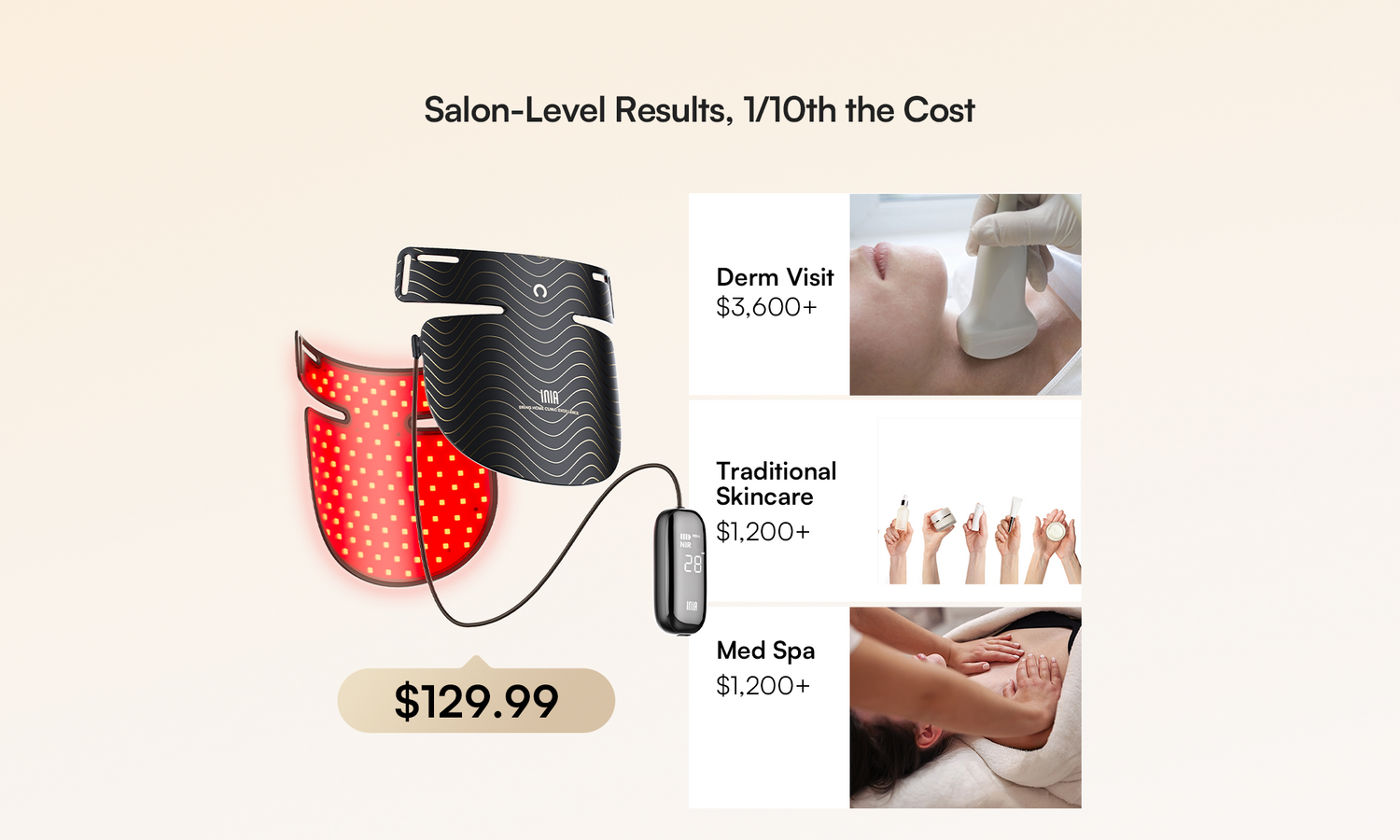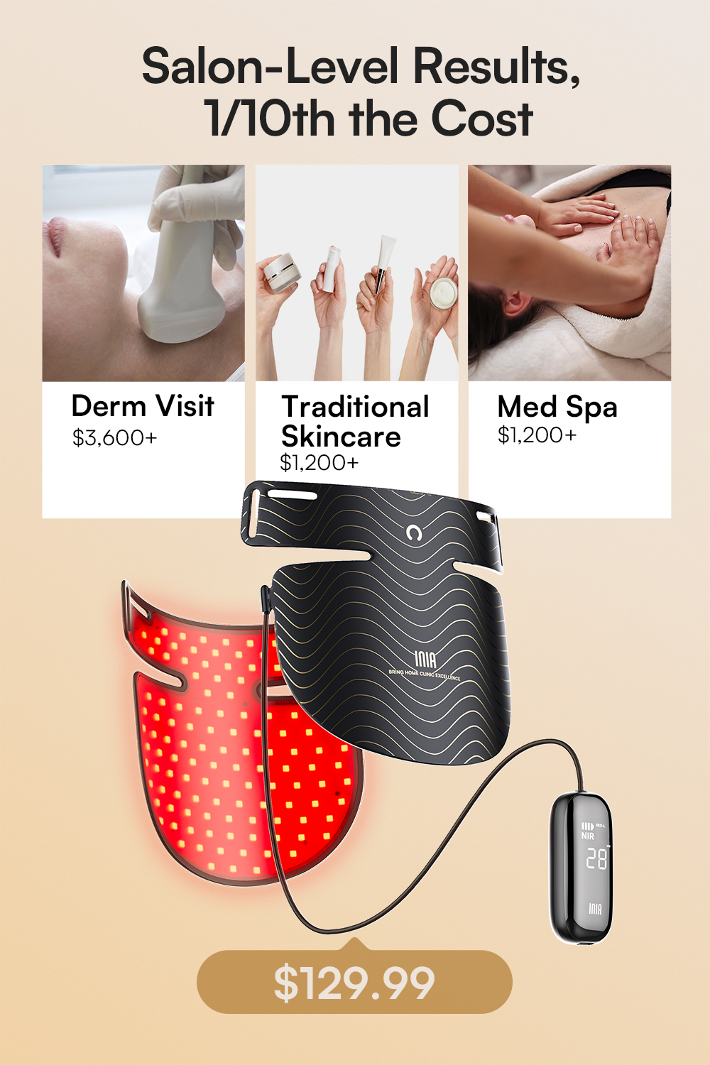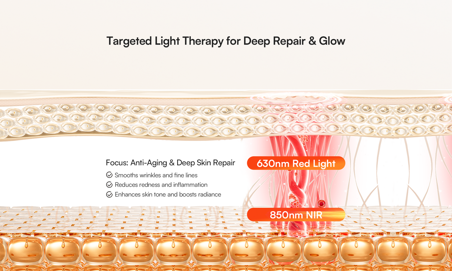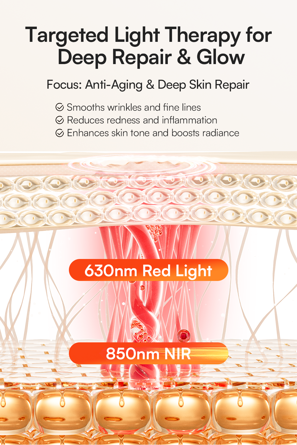 Our dual-wavelength technology (630nm red and 850nm NIR) works at a cellular level, penetrating up to 2x deeper. This synergy helps stimulate collagen-rich, firmer skin, reduces fine lines, and supports overall skin renewal for a smoother, younger-looking appearance in areas often neglected by traditional face masks.