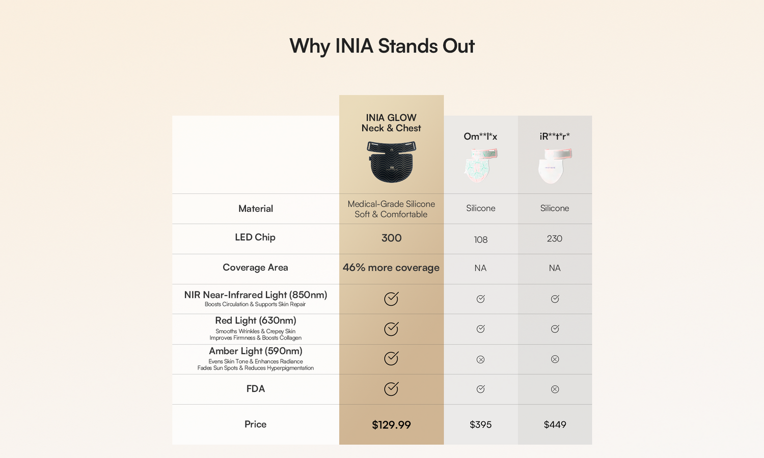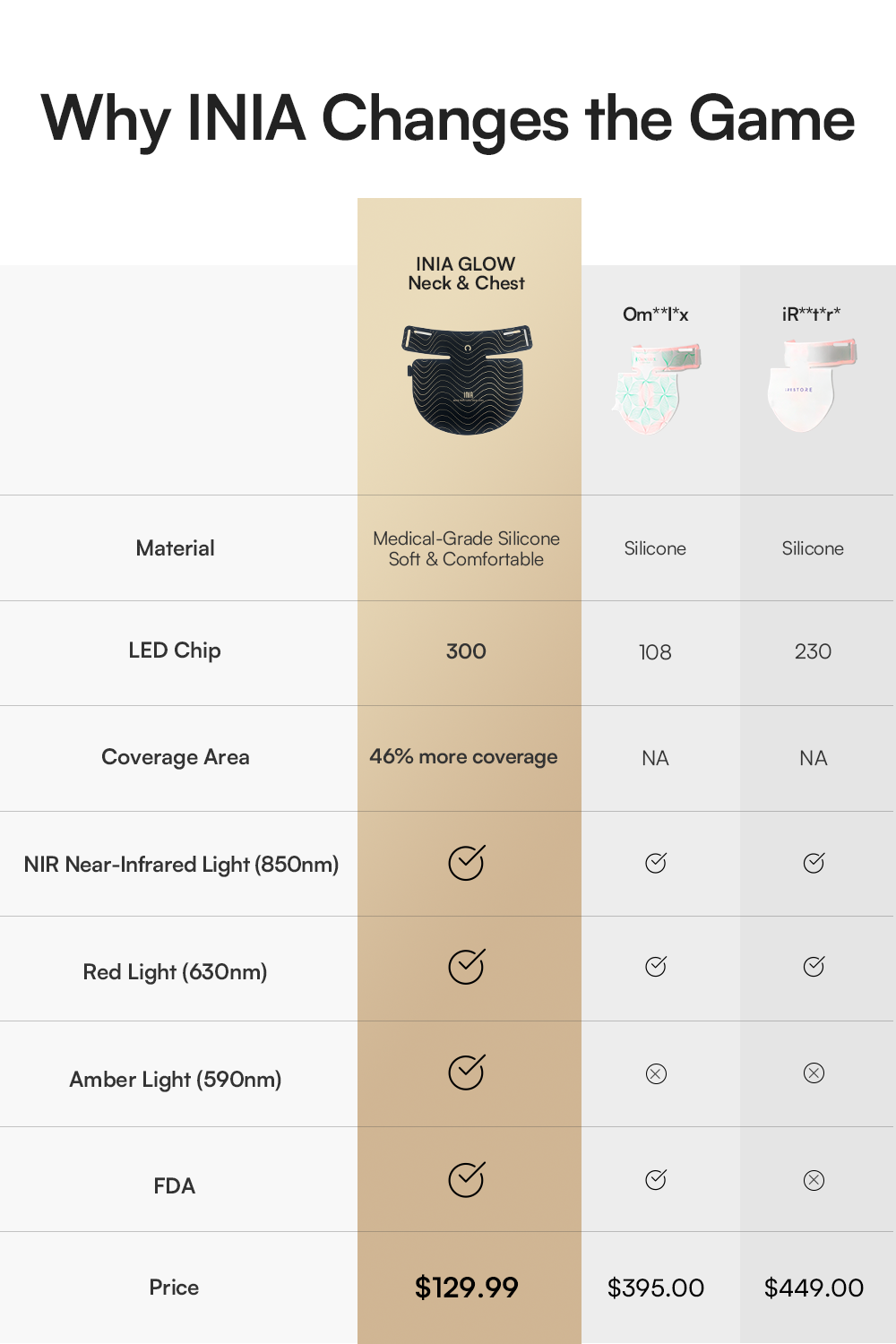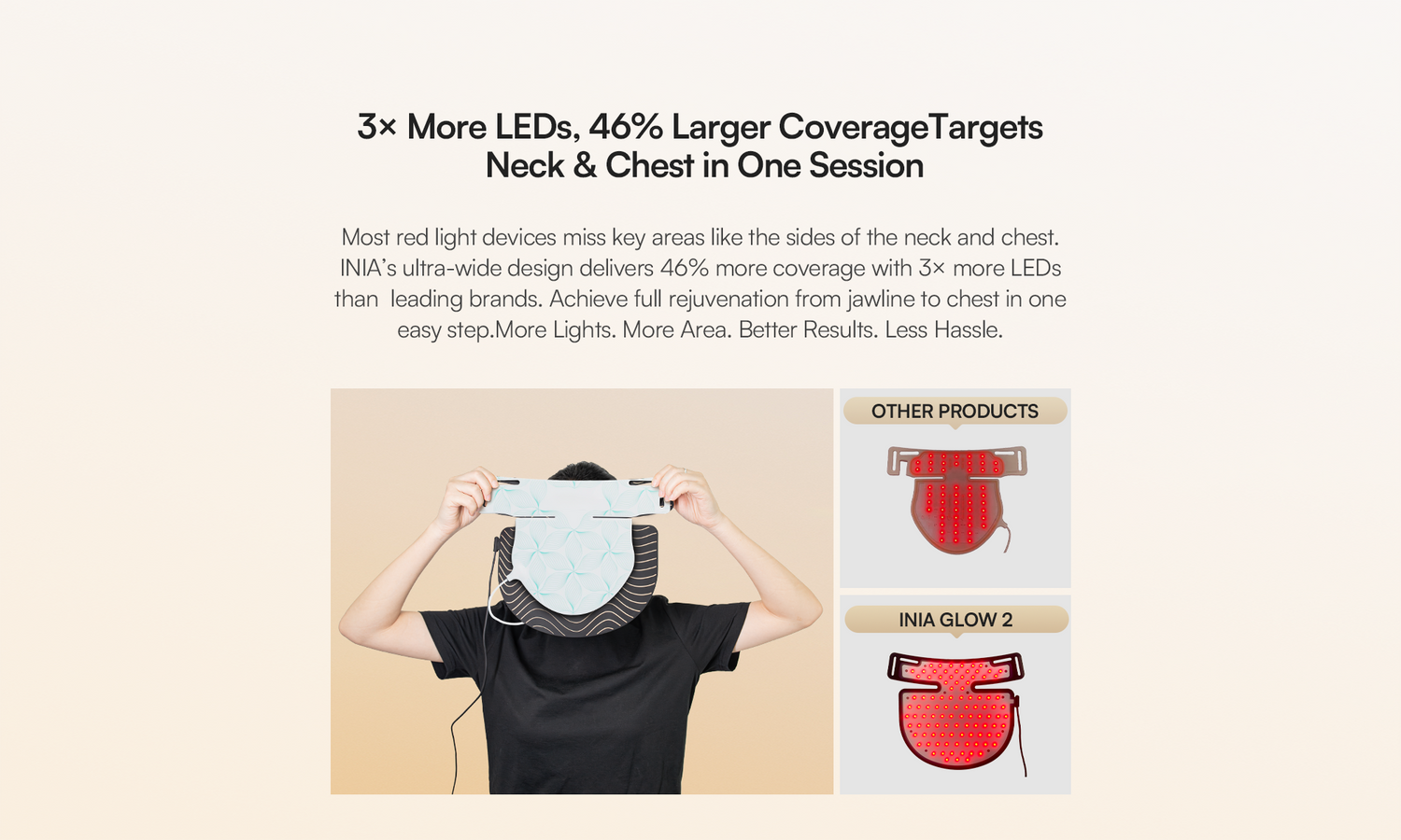 Our INIA GLOW 2 features a high-coverage panel with 228 high-energy LED chips delivering powerful output. This ensures up to 46% more coverage and 3x more LEDs than leading brands, providing even light diffusion for comprehensive treatment across your neck and chest.