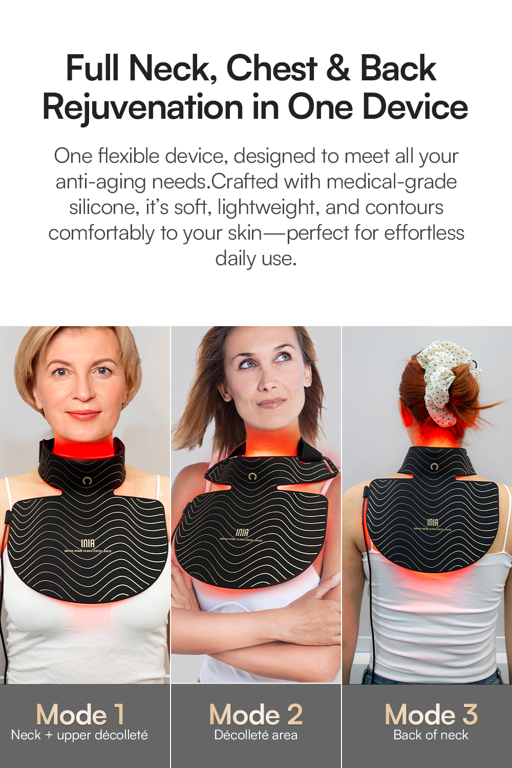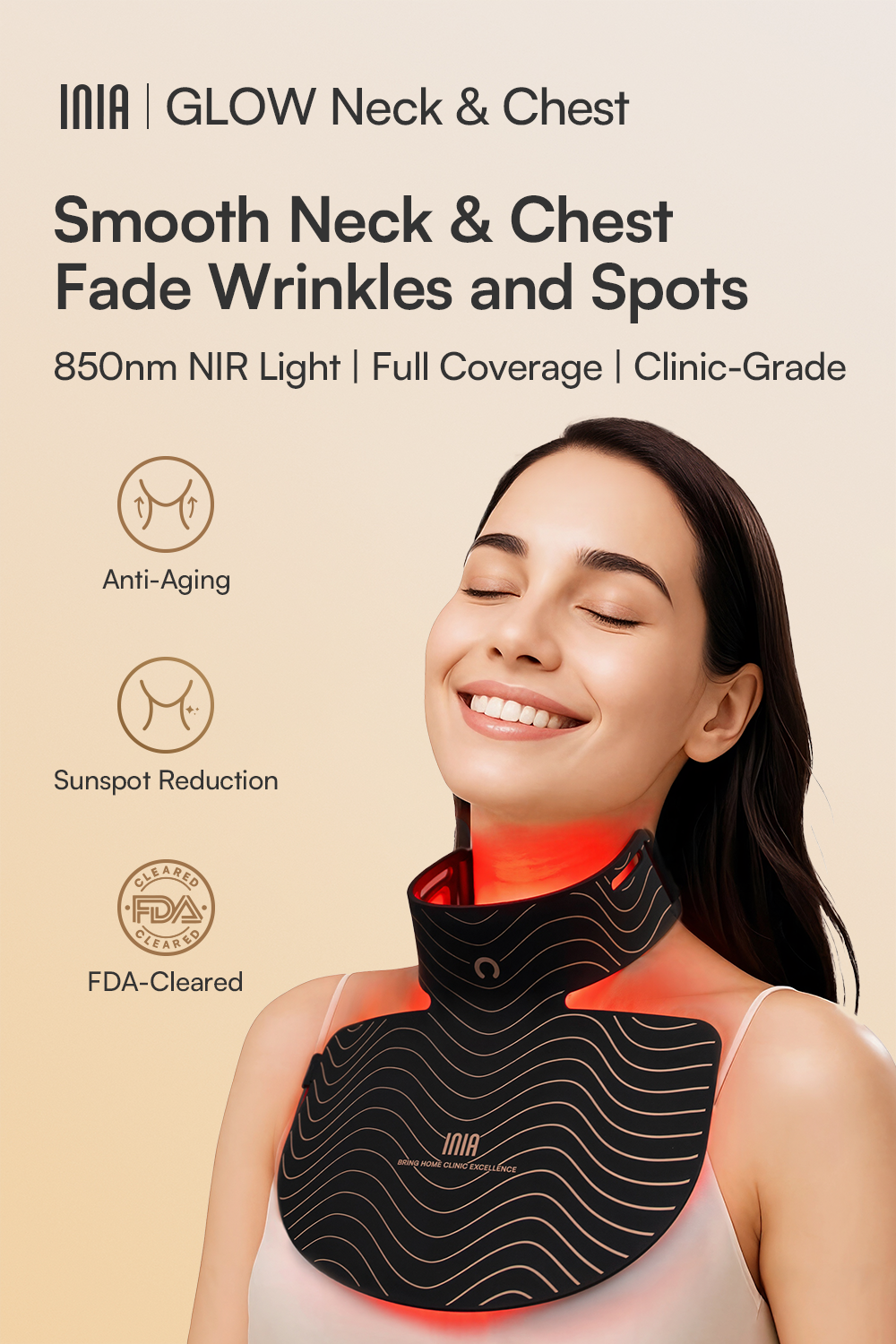 The INIA GLOW 2 is a professional-grade, non-invasive device designed for your neck and décolleté. It combines clinically proven 630nm Red Light and 850nm Near-Infrared (NIR) Therapy to target multiple skin layers for visible renewal, firmness, and a radiant glow. Plus, customize your routine with three light modes—Red-L, Red-H, and Yellow—each pairable with NIR to boost results. It adapts to your evolving skincare needs for targeted care, all from the comfort of your home.