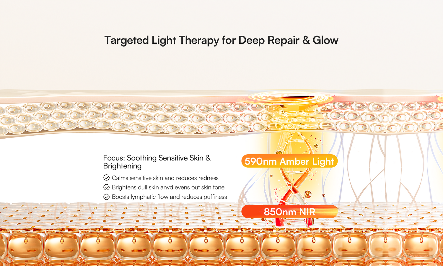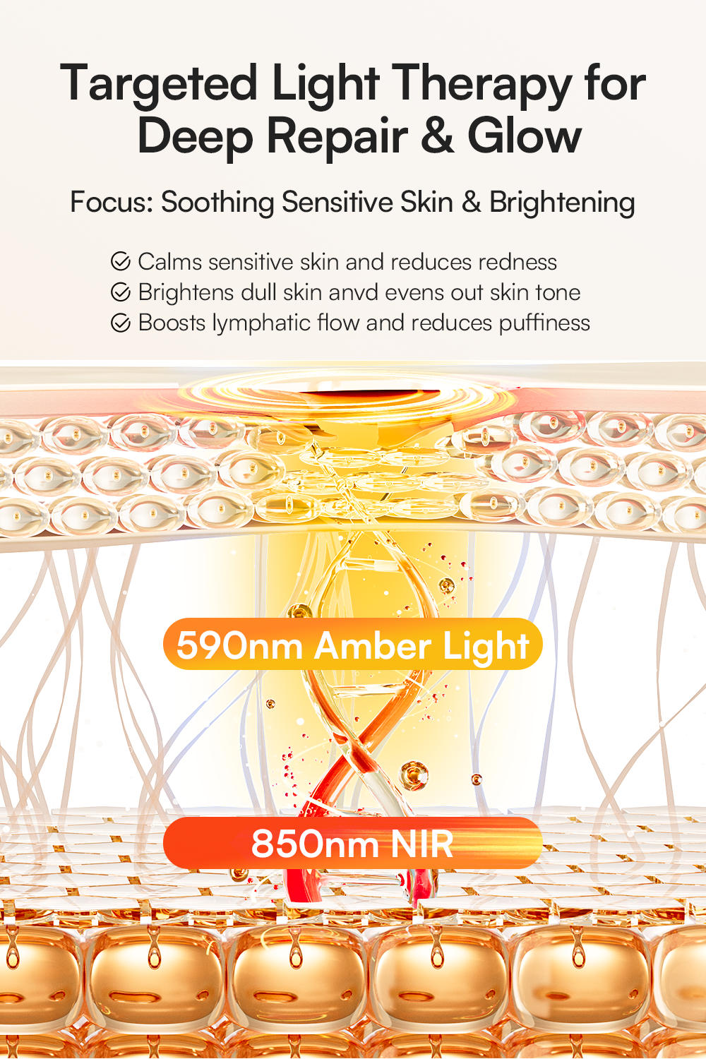 Customize your skincare with three versatile light modes: Red-L (630nm) and Red-H (630nm) for firmness and renewal, plus Yellow (590nm) for evening out skin tone and refreshing tired-looking skin. Each mode can be paired with NIR for boosted visible results, adapting to your evolving needs.
