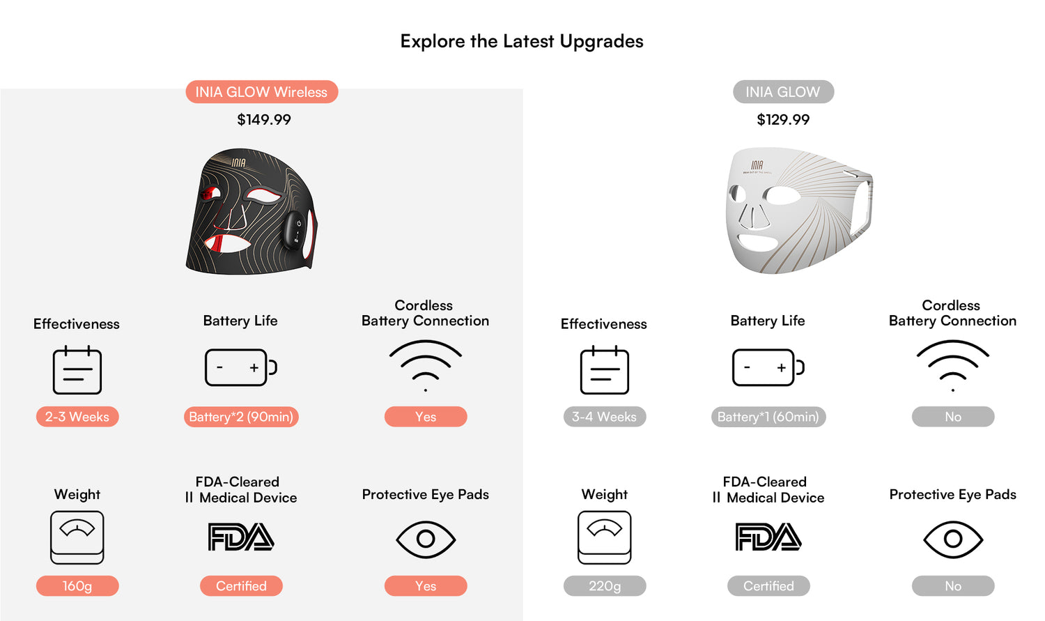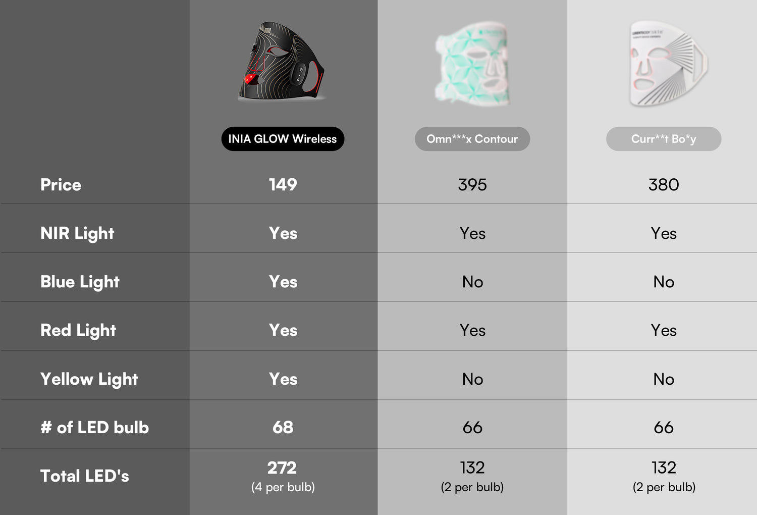 Yes, In a red light therapy mask the quality and irradiance power of the LEDs are key to achieving effective results. The INIA GLOW Wireless red light therapy mask uses 272 medical-grade LEDs (68 bulbs with 4 LEDs each) to deliver a powerful irradiance of 105mW/cm². This energy enables the red, blue, yellow, and near-infrared wavelengths to penetrate deeply, stimulating ATP regeneration in skin cells, which helps address issues like melasma, rosacea, redness, and scars. Many budget devices may have numerous LEDs but often lack sufficient irradiance, frequently below 5mW/cm², limiting their therapeutic effects.