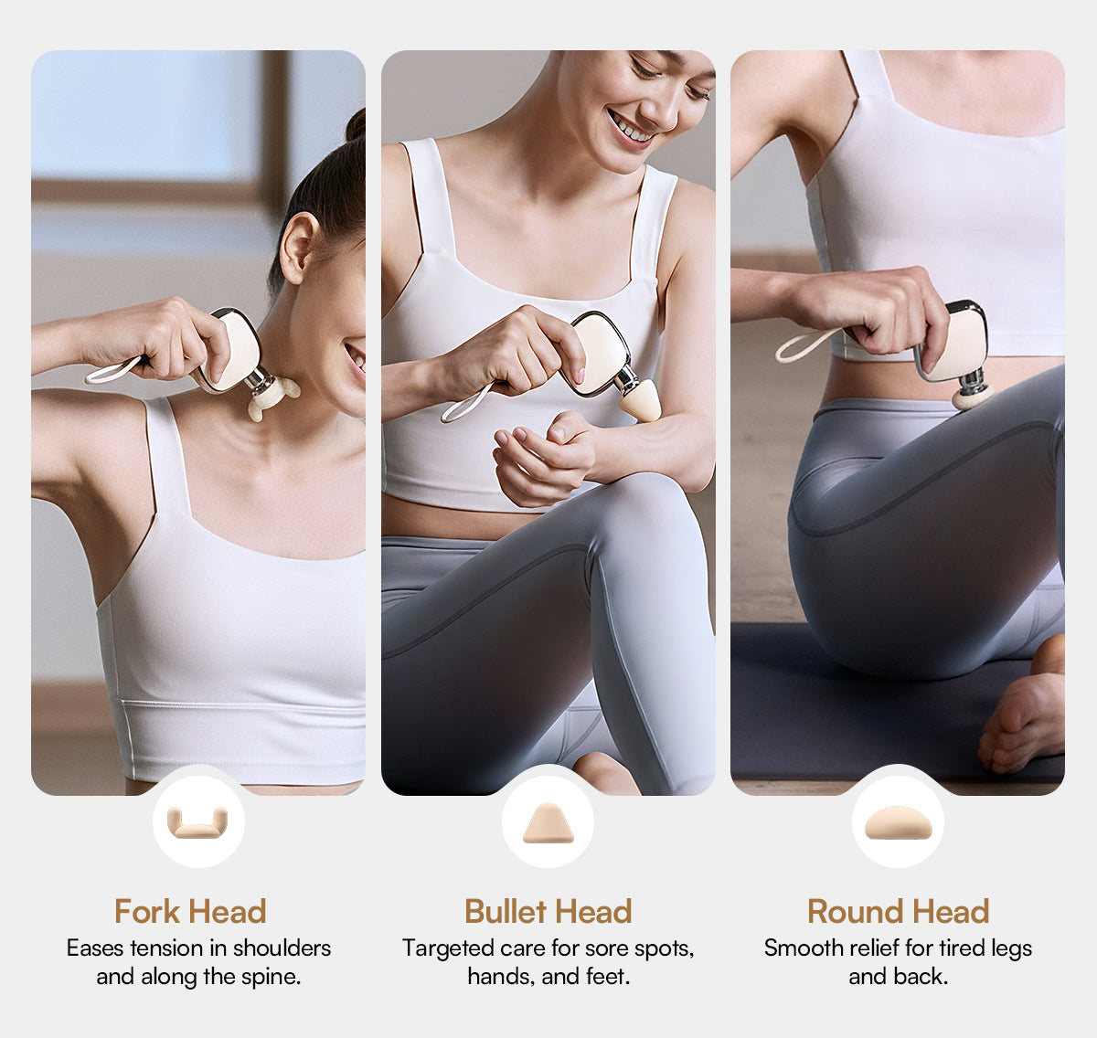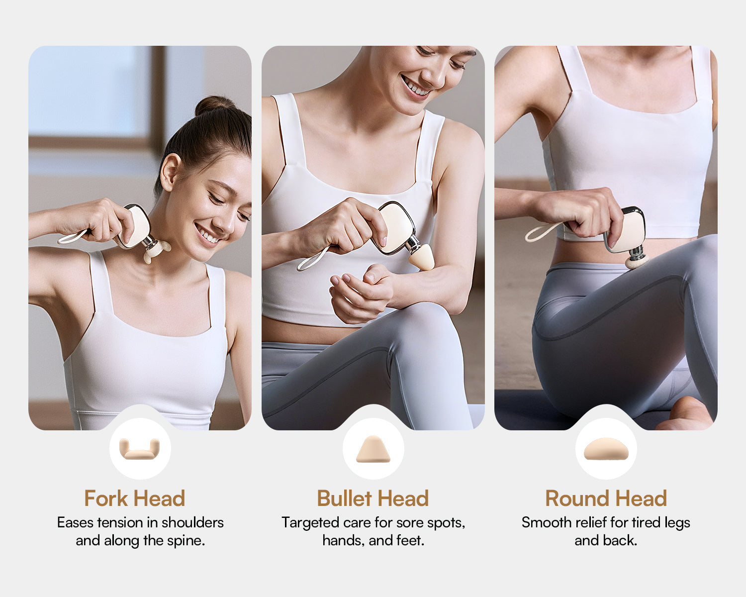 - Fork Head: Perfectly suited for the shoulders and for massaging the muscles along the spine while avoiding the bone.