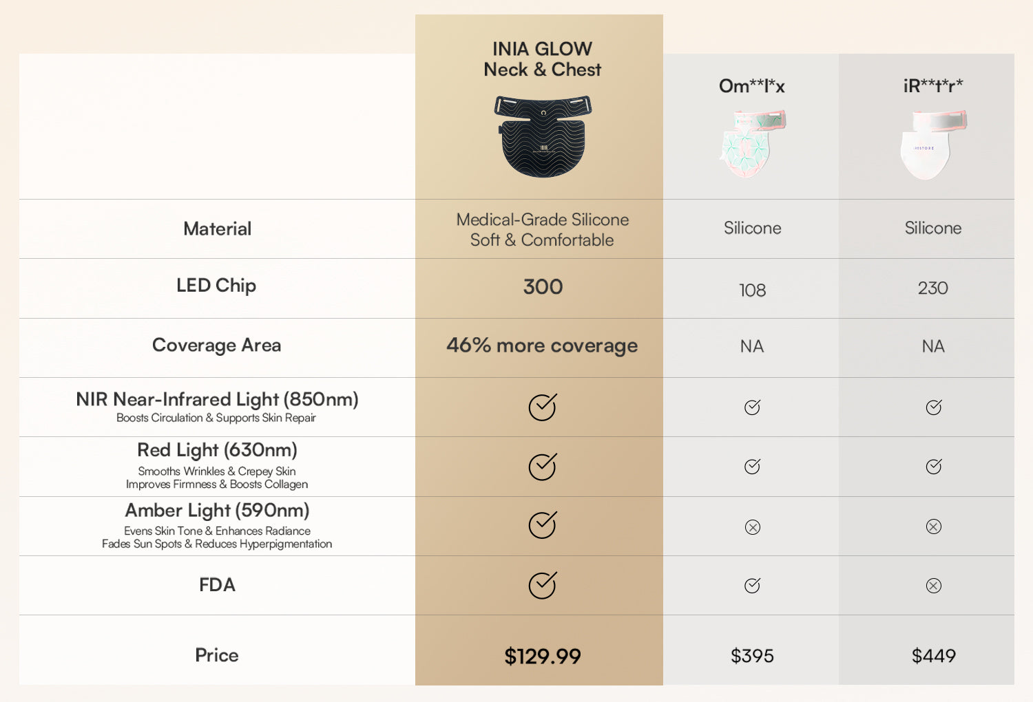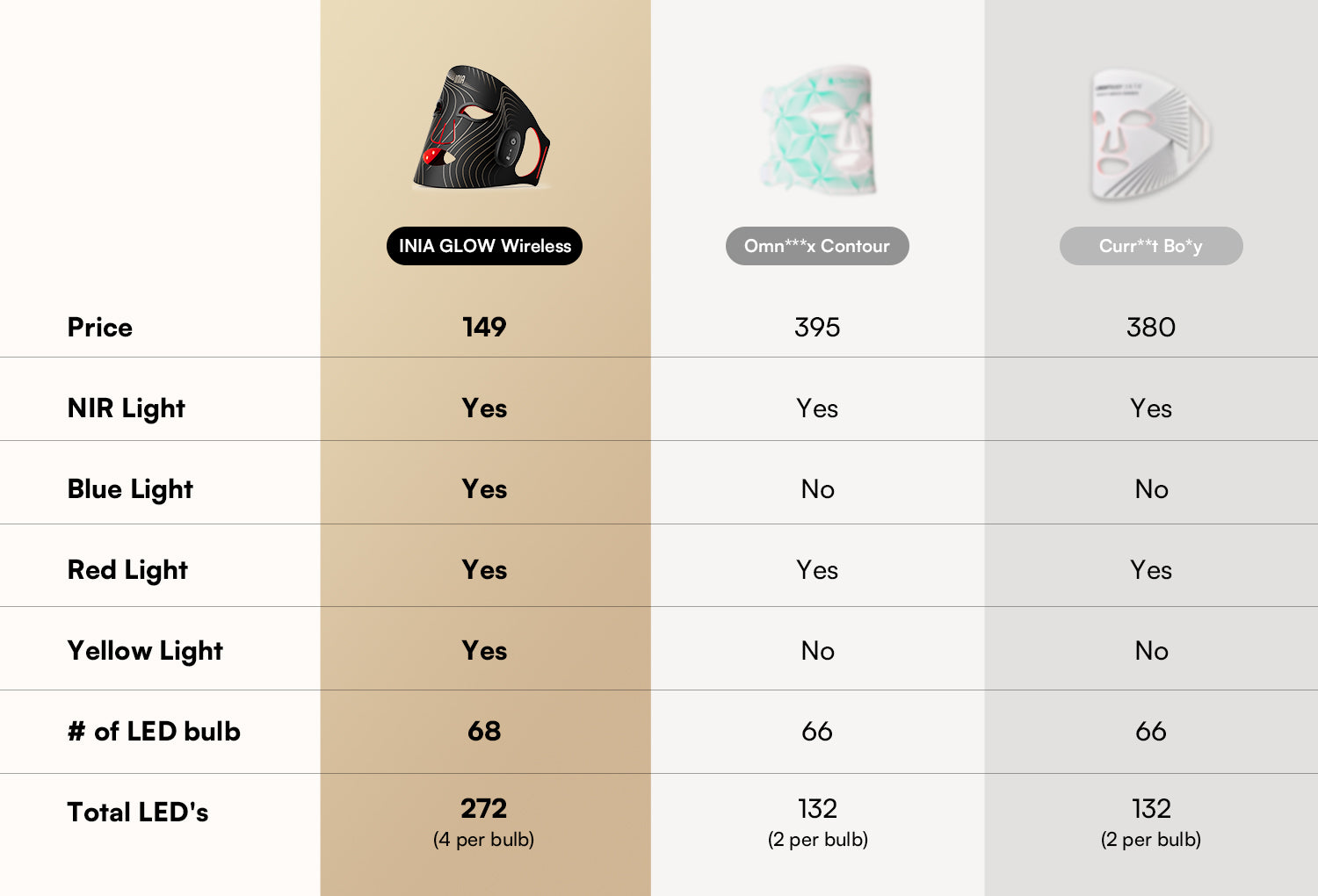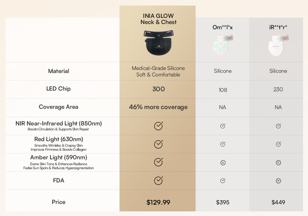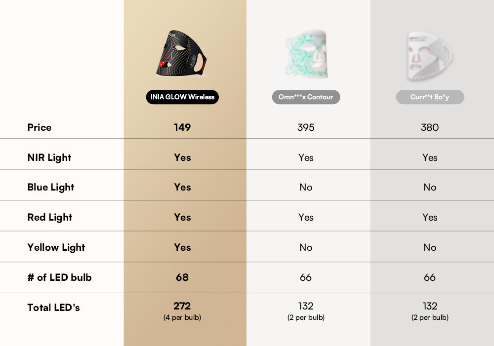 Yes, In a red light therapy mask the quality and irradiance power of the LEDs are key to achieving effective results. The INIA GLOW Wireless red light therapy mask uses 272 medical-grade LEDs (68 bulbs with 4 LEDs each) to deliver a powerful irradiance of 105mW/cm². This energy enables the red, blue, yellow, and near-infrared wavelengths to penetrate deeply, stimulating ATP regeneration in skin cells, which helps address issues like melasma, rosacea, redness, and scars. Many budget devices may have numerous LEDs but often lack sufficient irradiance, frequently below 5mW/cm², limiting their therapeutic effects.