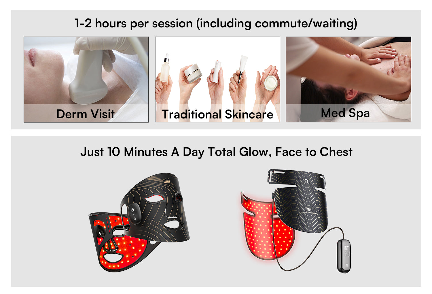 The INIA GLOW wireless red light therapy mask is designed for safe daily use. For best results, we recommend following the specific usage frequency suggested in the user manual. Regular use, as advised, can help achieve and maintain optimal results without overexposure.