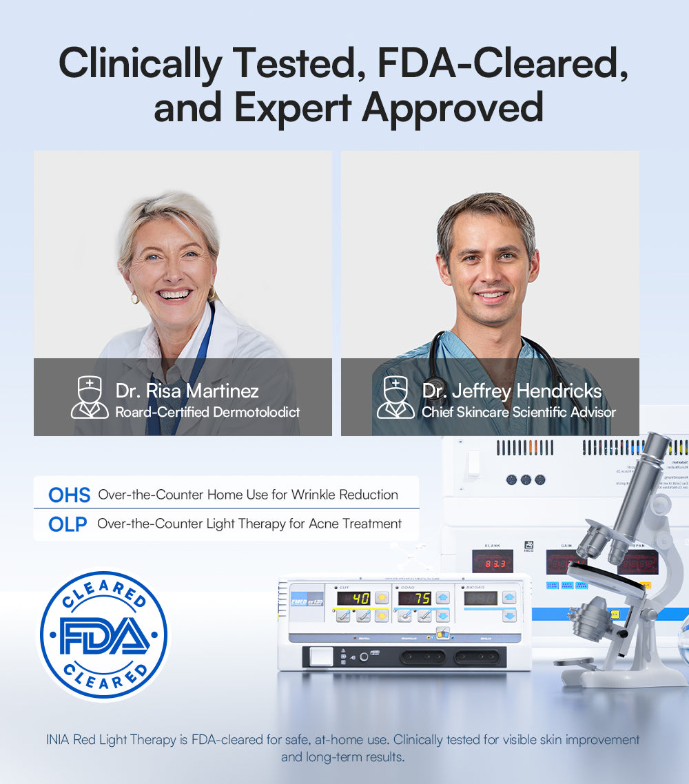 Absolutely! The INIA GLOW Wireless Mask is FDA-cleared, meaning it meets safety standards and can be used without protective goggles. The mask is designed to lie directly on your skin, and its LED lights are placed at a clinically safe distance from the eye area.