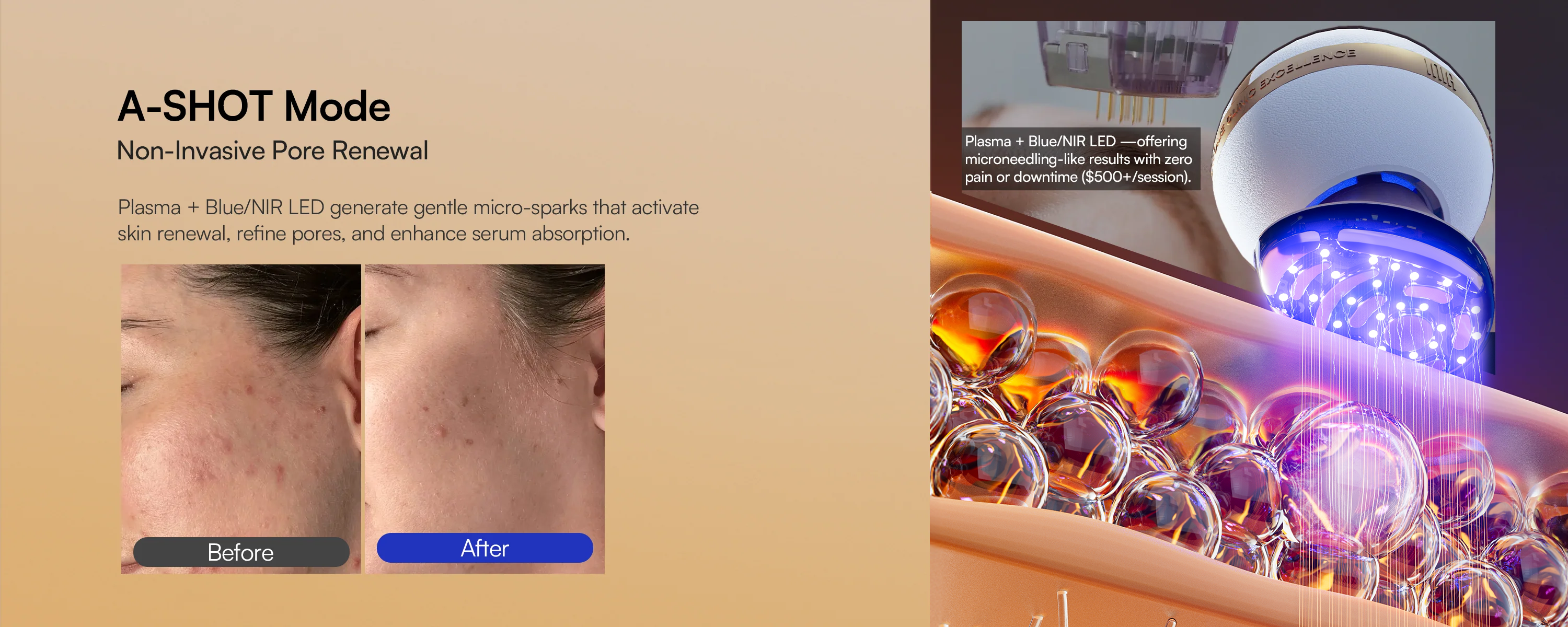 This is the SPHERA's "secret weapon." The FLARE uses Iontophoresis (1st Gen tech), which can only "push" small, charged ingredients. Our INFUSE+ mode uses Electroporation (2nd Gen tech). It temporarily "opens" channels in your skin, allowing it to absorb the large-molecule, "neutral" ingredients that 1st gen tech leaves behind—like Retinol, Peptides, Hyaluronic Acid, and Collagen. It makes your entire existing skincare routine more powerful.